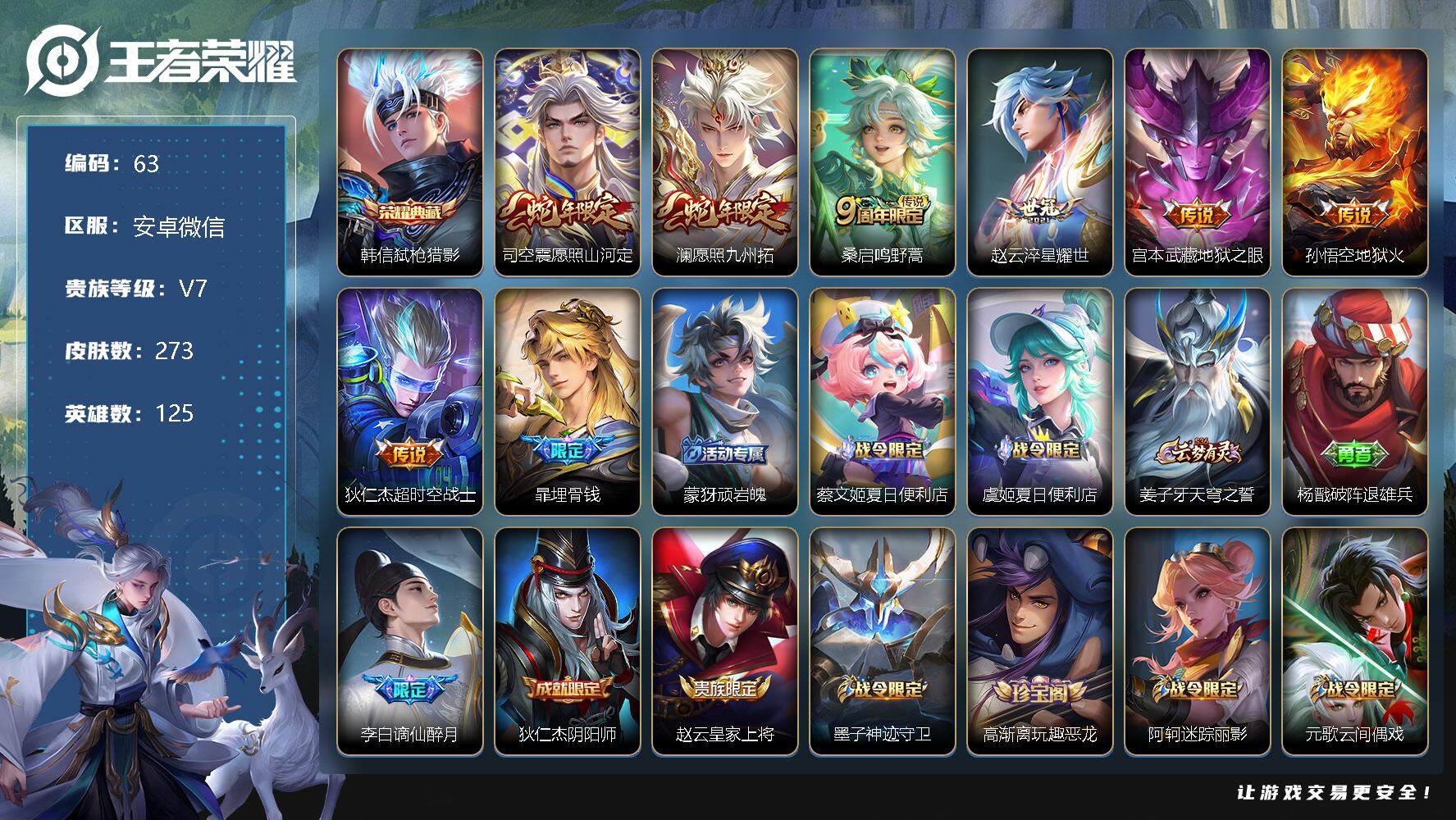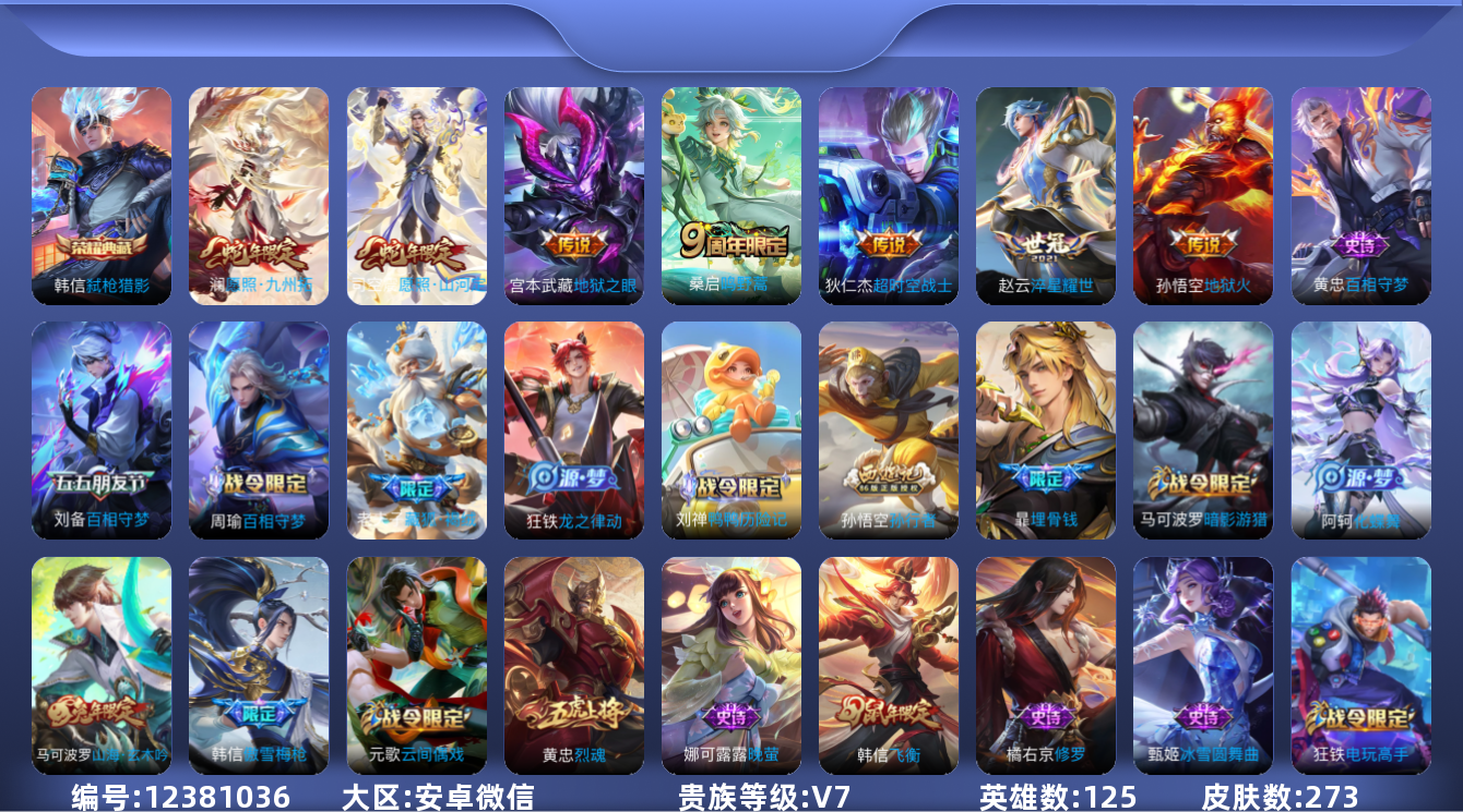 [12381036]【商品标题】:AK526-安卓WX-V7-至尊星耀II段位-125英雄-273皮肤-1典藏-0珍品无双-0无双-0珍品传说-7传说-85史诗