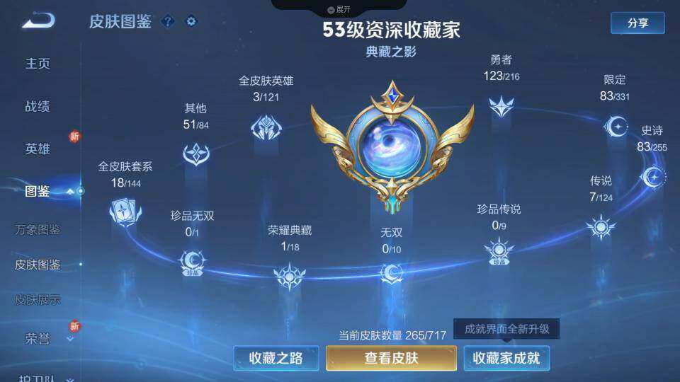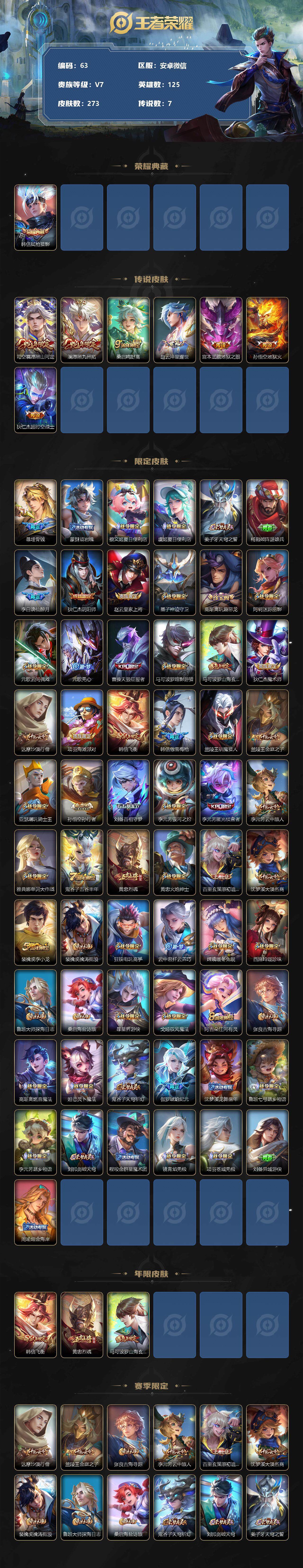 - [11878882]V9 3典藏 17传说 126英雄 349皮肤 典藏英雄武则天 可修改实名 荣耀水晶:鸣剑·曳影,九霄神辉(木兰典藏),杀手不太冷 传说皮:云诺千山,幻光神枪,黄金射手座,零号·赤焰,地狱火,海洋之心,云霓雀翎,云鹰飞将(小将军),绛天战甲(鸡嘴战神),超时空战士-狄仁杰 珍宝阁皮:妄想食味,女武神,玩趣恶龙 限定皮:愿照·九州拓(澜年限),愿照·岁时盈(虞姬年限),逐霄战戟,鸣野蒿,白晶晶,高山流水,青龙志(铠年限),天狼运算者,梁祝,御风骁将(吕布年限),天狼溯光者,祈雪灵祝(雪兔子),李小龙,霸王别姬-项羽,霸王别姬-虞姬,默契交锋-兰陵王,孙行者,猪悟能,乒乒小将,蜜橘之夏,寅虎·瑞焰(虎皮蛋子),时之祈愿-云中君,玉兔公主 史诗皮:星界战将,茶境仙,器灵·浮梦炉,灵蛊蚀心,龙之律动,百相守梦-百里守约,涂山红红,东方月初,蒙犽顽岩魄,怒海争锋,海诺心动手记,蔬乡物语(鲁班七号),化蝶舞,紫霞仙子,电玩小子(小书包),黄金分割率,特工魅影,江河有灵,雪夜绮愿(周瑜),百解令(蒙犽),冰冠公主,偶像歌手,无限星赏官,暗夜猫娘,龙骑士(小龙虾),猫狗日记-大乔,时之恋人-孙尚香,乱世虎臣,节奏热浪,女仆咖啡,摇滚巨星,水果甜心,绅士熊喵,天才门将,星夜王子,心灵骇客,时之奇旅-安琪拉,功夫厨神,德古拉伯爵,暗隐猎兽者,幽灵船长,鬼剑武藏,暗渊魔法,心灵战警,舞动绿茵,地狱岩魂,纤云弄巧,拒霜思,缤纷独角兽,乘风破浪,逐浪之夏,水晶猎龙者,曙光守护者,金属风暴,圣诞狂欢,圣诞恋歌,鹰眼统帅,暗夜贵公子,魅力维加斯,赏金猎手,奇遇舞章,未来纪元-赵云