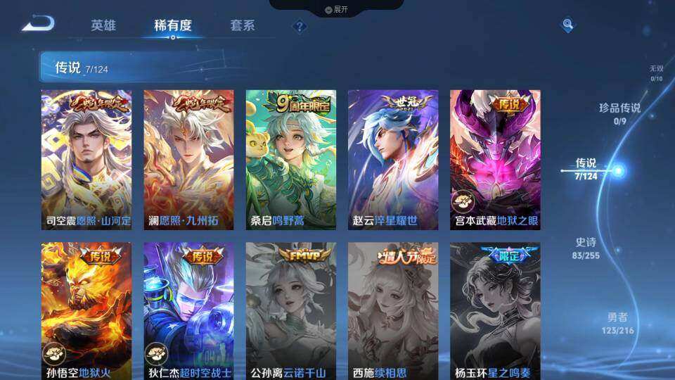 【传说皮肤】:司空震愿照山河定,澜愿照九州拓,桑启鸣野蒿,赵云淬星耀世,宫本武藏地狱之眼,孙悟空地狱火,狄仁杰超时空战士