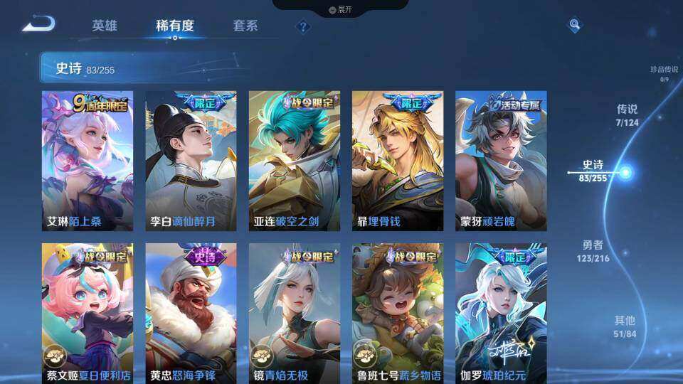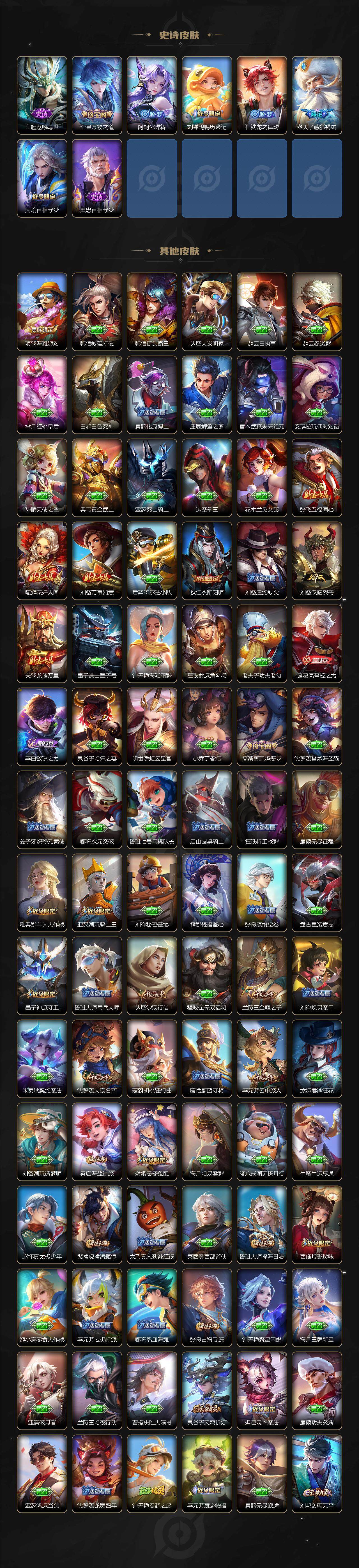 【史诗皮肤】:鲁班七号电玩小子,项羽苍穹之光,露娜紫霞仙子,赵云皇家上将,赵云未来纪元,甄姬冰雪圆舞曲,狄仁杰魔术师,廉颇地狱岩魂,宫本武藏鬼剑武藏,孙尚香水果甜心,嬴政摇滚巨星