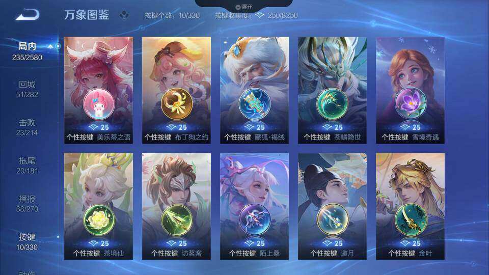 小乔青蛇,娜可露露晚萤,伽罗箭羽风息,李元芳逐浪之夏,孙策猫狗日记,阿轲节奏热浪,露娜紫霞仙子,诸葛亮黄金分割率,项羽苍穹之光,吕布末日机甲,鲁班七号电玩小子,橘右京修罗,嬴政摇滚巨星,刘禅天才门将,白起星夜王子,程咬金功夫厨神,刘邦德古拉伯爵,兰陵王暗隐猎兽者,曹操幽灵船长,宫本武藏鬼剑武藏,司马懿暗渊魔法,亚瑟心灵战警,杨戬天秀·启明,廉颇地狱岩魂,小乔缤纷独角兽,百里玄策热力回旋,墨子金属风暴,百里玄策原初追逐者,吕布圣诞狂欢,百里守约特工魅影,李白千年之狐,夏洛特永昼,澜赏金猎手,刘备百相守梦,李元芳匿光侦查者,高渐离燃音魔法,伽罗琥珀纪元,李白谪仙醉月,白起苍鳞隐世