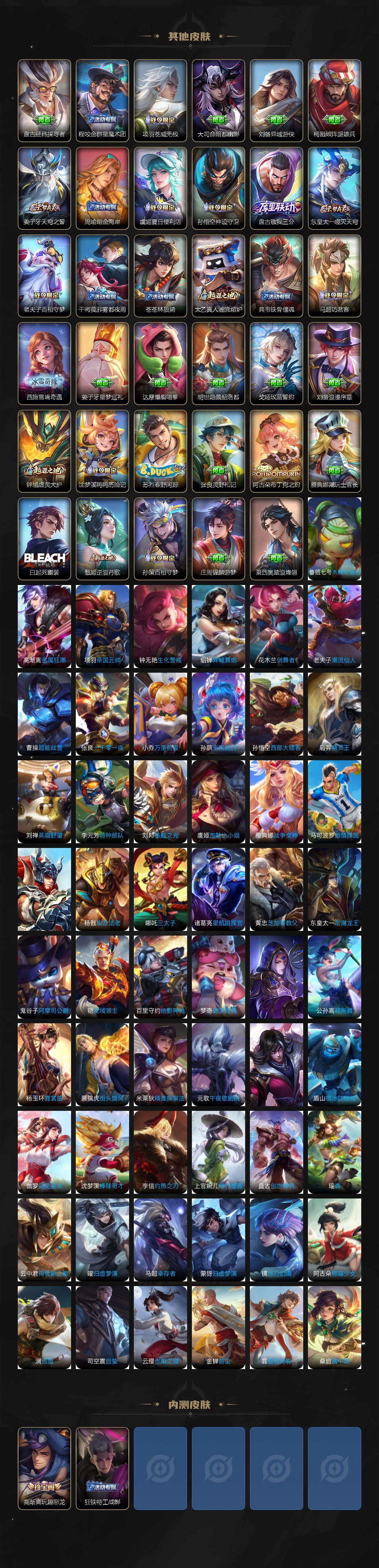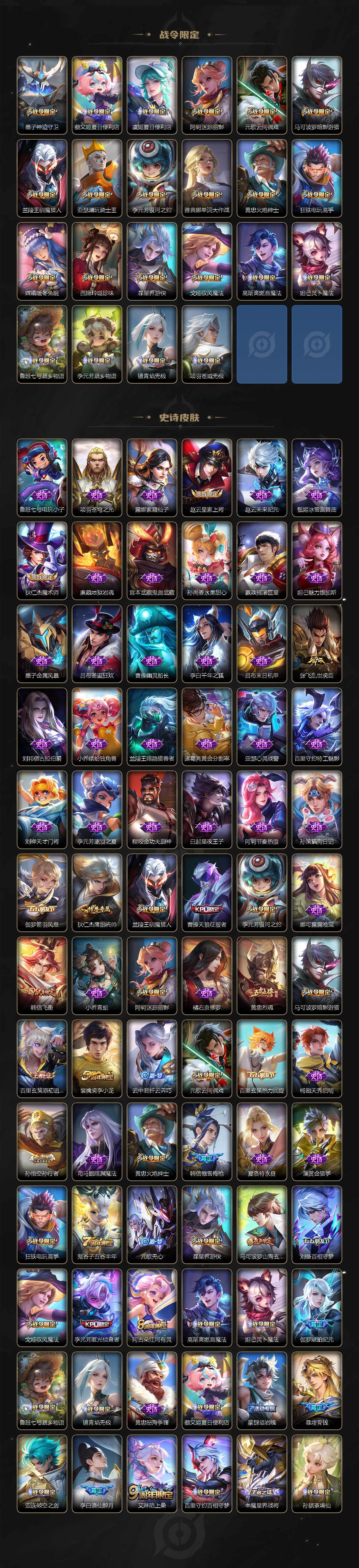 【限定皮肤】:暃埋骨钱,蒙犽顽岩魄,蔡文姬夏日便利店,虞姬夏日便利店,姜子牙天穹之誓,杨戬破阵退雄兵,李白谪仙醉月,狄仁杰阴阳师,赵云皇家上将,墨子神迹守卫,高渐离玩趣恶龙,阿轲迷踪丽影,元歌云间偶戏,元歌无心,曹操天狼征服者,马可波罗暗影游猎,马可波罗山海玄木吟,狄仁杰魔术师,达摩沙漠行僧,项羽海滩派对,韩信飞衡,韩信傲雪梅枪,兰陵王驯魔猎人,兰陵王金庭之子,亚瑟潮玩骑士王,孙悟空孙行者,刘备百相守梦,李元芳银河之约,李元芳匿光侦查者,李元芳云中旅人,雅典娜单词大作战,鬼谷子五谷丰年,黄忠烈魂,黄忠火炮绅士,百里玄策原初追逐者,沈梦溪大漠名商,裴擒虎李小龙,裴擒虎擒涛扼浪,狂铁电玩高手,云中君纤云弄巧,嫦娥暖冬兔眠,西施玲珑珍味,鲁班大师探海日志,桑启海盐诗旅,暃星界游侠,戈娅驭风魔法,阿古朵江河有灵,张良古海寻踪,高渐离燃音魔法,妲己灵卜魔法,鬼谷子天穹祈灯,伽罗琥珀纪元,沈梦溪龙舞盛年,鲁班七号蔬乡物语,李元芳蔬乡物语,刘邦剑破天穹,程咬金群星魔术团,镜青焰无极,项羽苍威无极,刘备异域游侠,周瑜熔金海岸