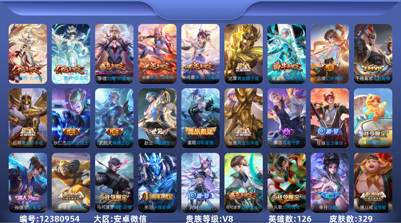 [12380954]【商品标题】:AK501-安卓WX-V8-永恒钻石I段位-126英雄-329皮肤-0典藏-0珍品无双-0无双-0珍品传说-15传说-89史诗