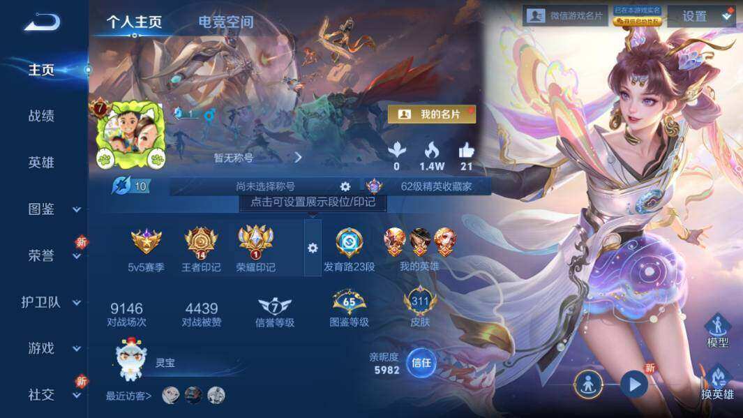 - PX_2097697-贵族等级: V5 英雄数: 79 皮肤数: 57 传说皮: 霜月吟,澜逐花归海,祥瑞亨通 限定皮: 鸣野蒿,逐霄战戟