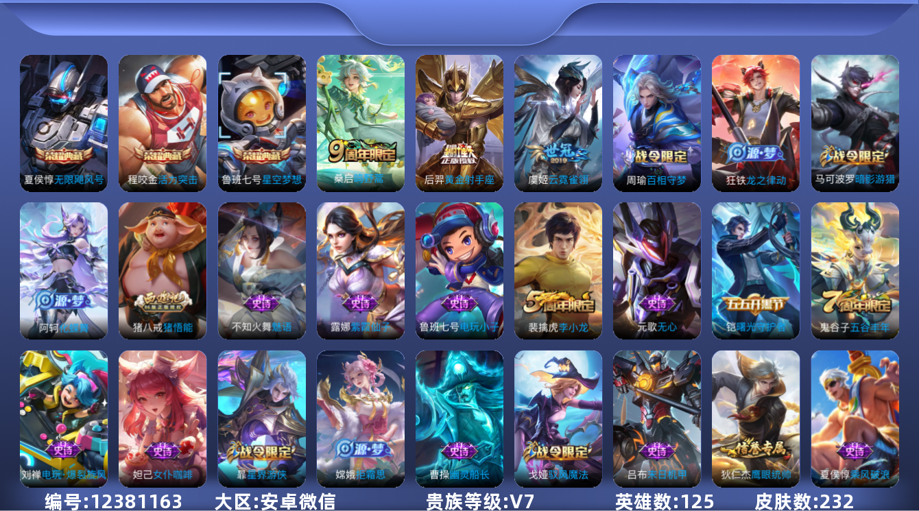 [12381163]AK583 :安卓WX-V7-最强王者段位-125英雄-232皮肤-3典藏-0珍品无双-0无双-0珍品传说-3传说-61史诗