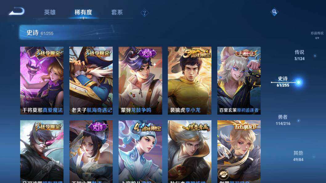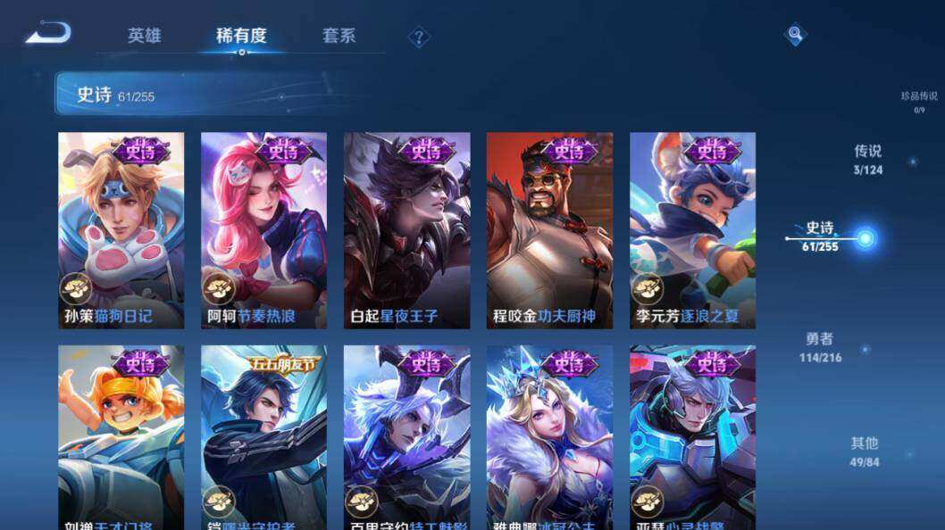 【史诗皮肤】:鲁班七号电玩小子,露娜紫霞仙子,赵云皇家上将,赵云未来纪元,王昭君偶像歌手,狄仁杰魔术师,廉颇地狱岩魂,宫本武藏鬼剑武藏,孙尚香水果甜心,嬴政优雅恋人,妲己女仆咖啡,墨子金属风暴,吕布圣诞狂欢,刘禅绅士熊喵,曹操幽灵船长,吕布末日机甲,张飞乱世虎臣,刘邦德古拉伯爵,夏侯惇乘风破浪,小乔缤纷独角兽,诸葛亮黄金分割率,亚瑟心灵战警,雅典娜冰冠公主,百里守约特工魅影,铠曙光守护者,刘禅天才门将,李元芳逐浪之夏,程咬金