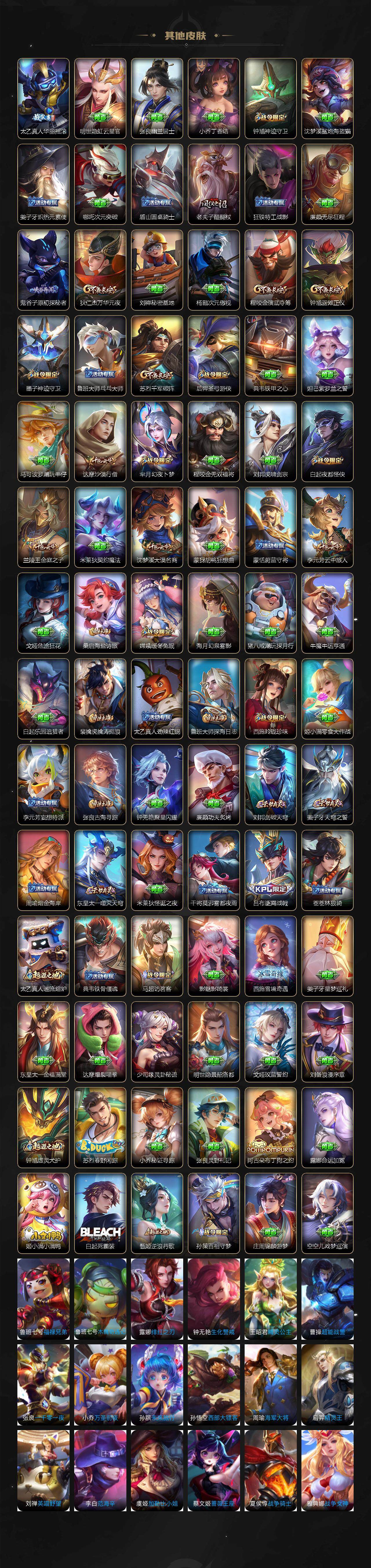 【限定皮肤】:蒙犽顽岩魄,姜子牙天穹之誓,狄仁杰阴阳师,赵云皇家上将,墨子神迹守卫,嬴政优雅恋人,庄周高山流水,高渐离死亡摇滚,白起夜都怪侠,芈月幻夜卜梦,元歌无心,马可波罗暗影游猎,狄仁杰魔术师,狄仁杰万华元夜,达摩沙漠行僧,项羽海滩派对,老夫子醍醐杖,老夫子航海奇遇记,程咬金演武夺筹,兰陵王金庭之子,后羿圣弓游侠,李元芳云中旅人,钟馗神迹守卫,钟馗驱傩正仪,干将莫邪真爱魔法,雅典娜黎明之约,太乙真人华丽摇滚,鬼谷子原初探秘者,鬼谷子五谷丰年,黄忠火炮绅士,苏烈千军破阵,百里玄策原初追逐者,梦奇顽趣,沈梦溪大漠名商,明世隐吟游魔法,裴擒虎李小龙,裴擒虎擒涛扼浪,猪八戒猪悟能,上官婉儿梁祝,嫦娥拒霜思,嫦娥暖冬兔眠,西施玲珑珍味,鲁班大师探海日志,桑启海盐诗旅,暃星界游侠,戈娅驭风魔法,艾琳女武神,阿古朵江河有灵,张良古海寻踪,蒙恬荣光圣徽,刘邦剑破天穹,周瑜熔金海岸