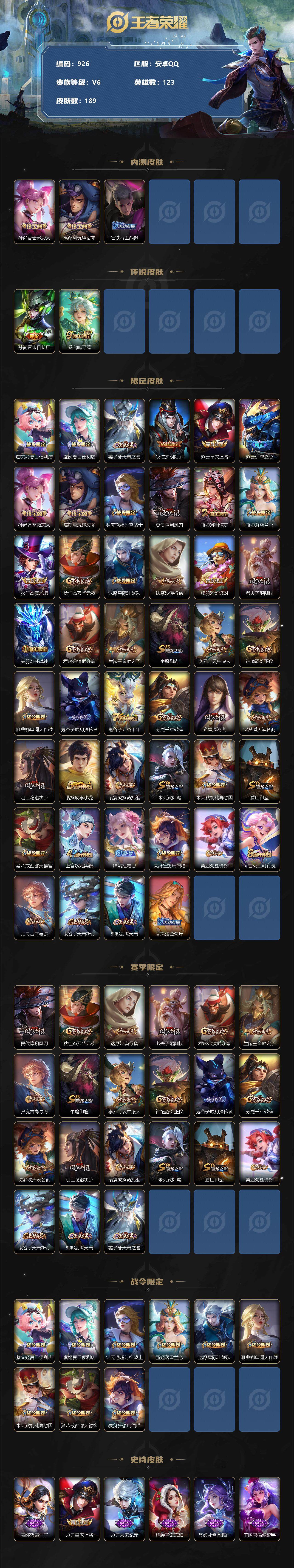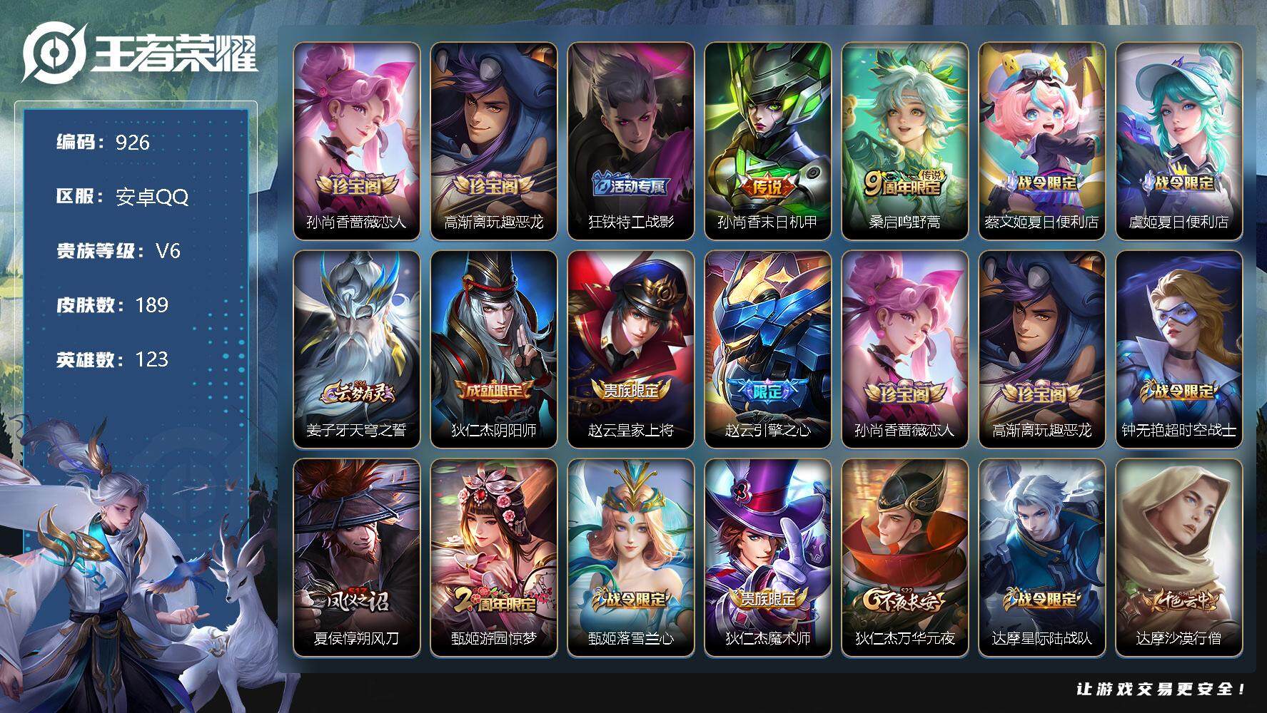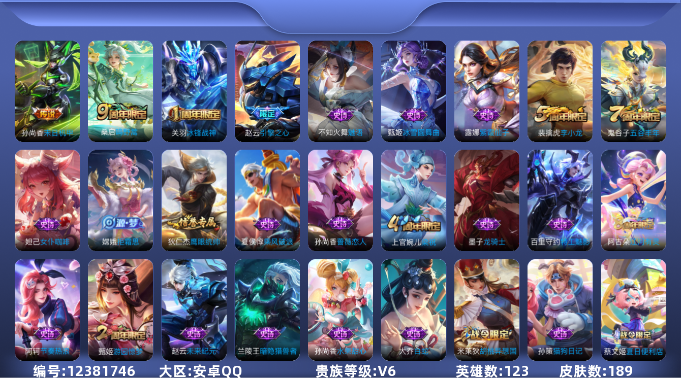 [12381746]【商品标题】:安卓Q-V5-至尊星耀III段位-123英雄-189皮肤-0典藏-0珍品无双-0无双-0珍品传说-2传说-42史诗