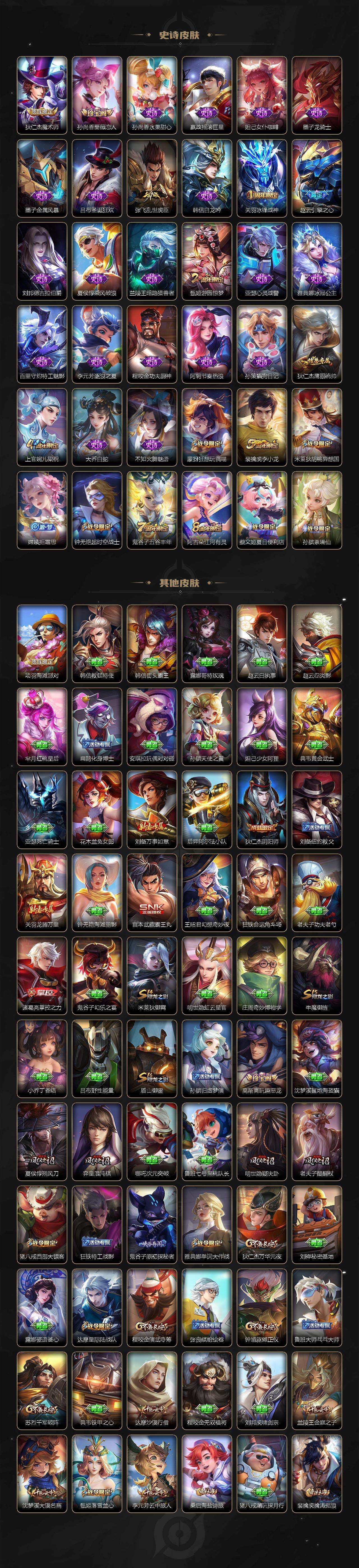 【史诗皮肤】:露娜紫霞仙子,赵云皇家上将,赵云未来纪元,貂蝉圣诞恋歌,甄姬冰雪圆舞曲,王昭君偶像歌手,狄仁杰魔术师,孙尚香蔷薇恋人,孙尚香水果甜心,嬴政摇滚巨星,妲己女仆咖啡,墨子龙骑士,墨子金属风暴,吕布圣诞狂欢,张飞乱世虎臣,韩信白龙吟,关羽冰锋战神,赵云引擎之心,刘邦德古拉伯爵,夏侯惇乘风破浪,兰陵王暗隐猎兽者,甄姬游园惊梦,亚瑟心灵战警,雅典娜冰冠公主,百里守约特工魅影,李元芳逐浪之夏,程咬金功夫厨神,阿轲节奏热浪,孙策猫狗日记,狄仁杰鹰眼统帅,上官婉儿梁祝,大乔白蛇,不知火舞魅语,蒙犽狂想玩偶喵,裴擒虎李小龙,米莱狄胡桃异想国,嫦娥拒霜思,钟无艳超时空战士