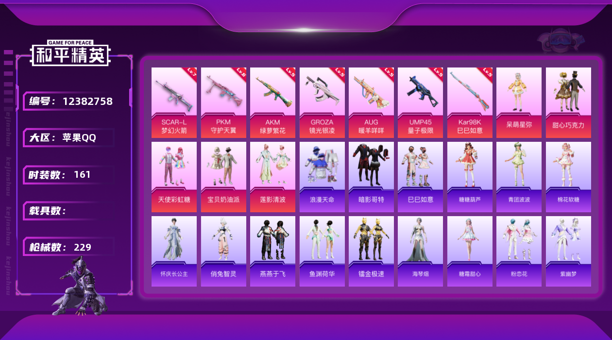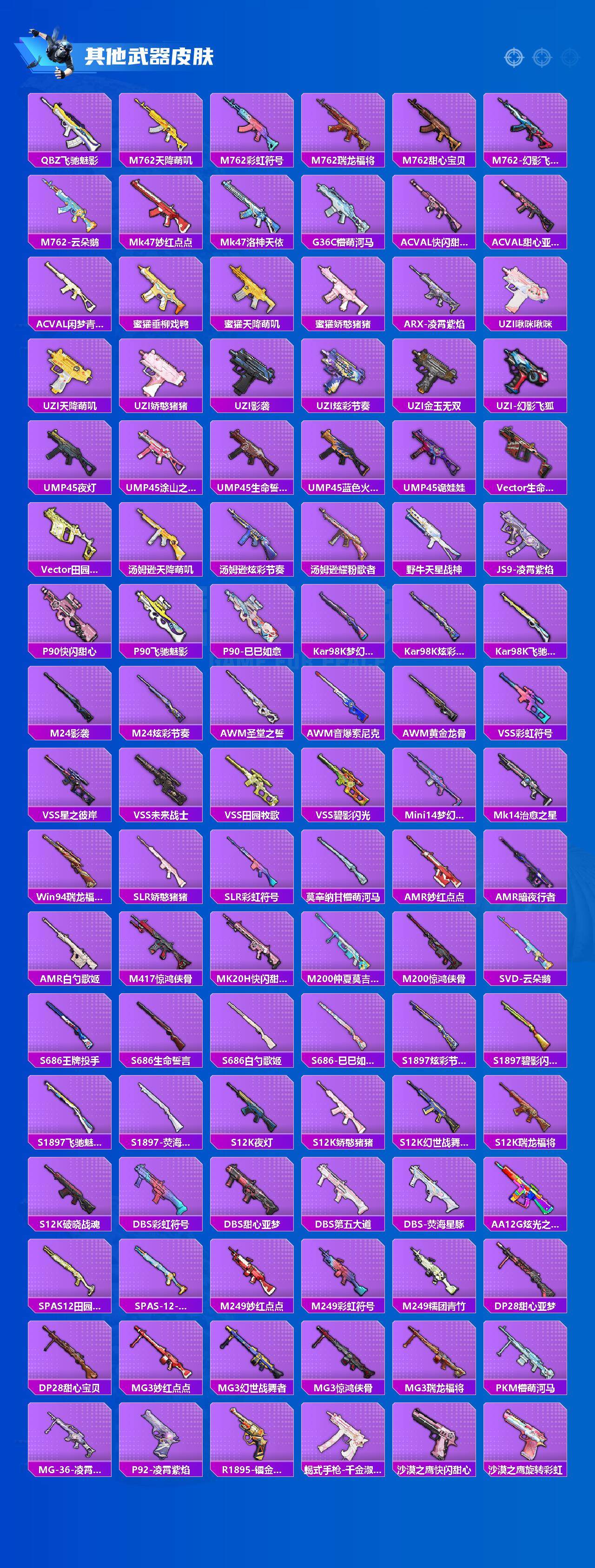 【粉色枪皮】:AKM-绿萝繁花,SCAR-L-梦幻火箭,GROZA-镜光银凌,AUG-暖羊咩咩,UMP45-量子极限,Kar98K-巳巳如意,Mk14-甜梦熊击,DP-28-豹影疾电,PKM-守护天翼