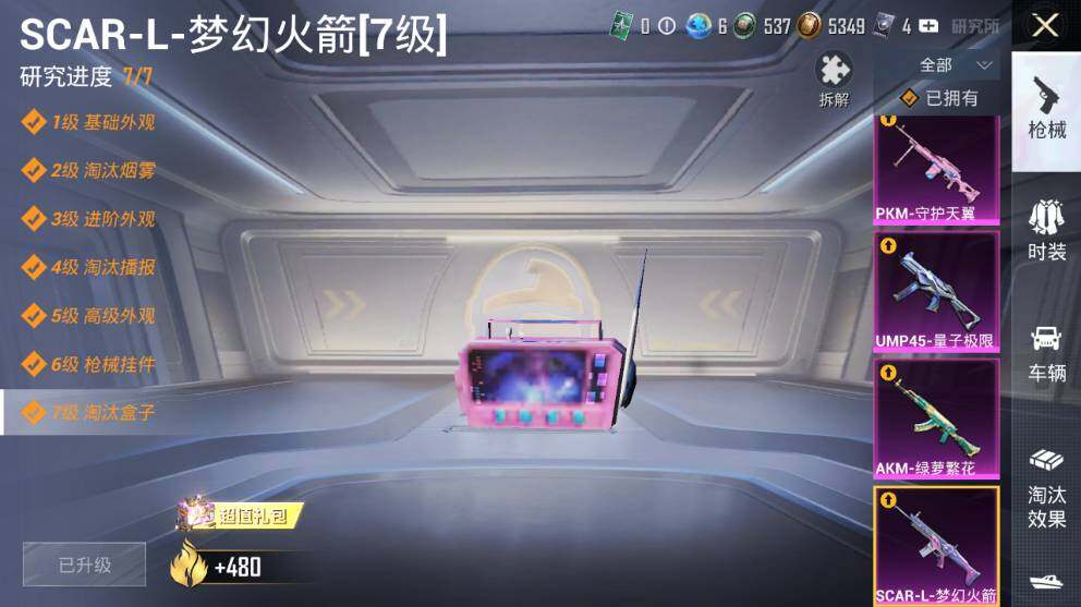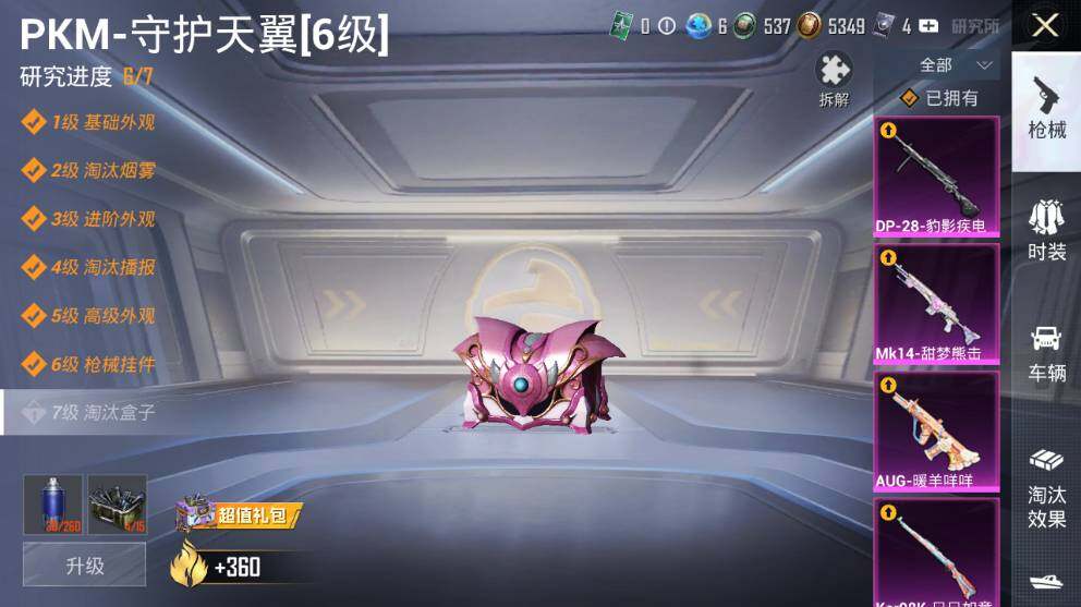 【粉色枪皮等级】:AKM-绿萝繁花(五级),SCAR-L-梦幻火箭(七级),GROZA-镜光银凌(五级),AUG-暖羊咩咩(五级),UMP45-量子极限(五级),Kar98K-巳巳如意(五级),Mk14-甜梦熊击(五级),DP-28-豹影疾电(五级),PKM-守护天翼(六级)