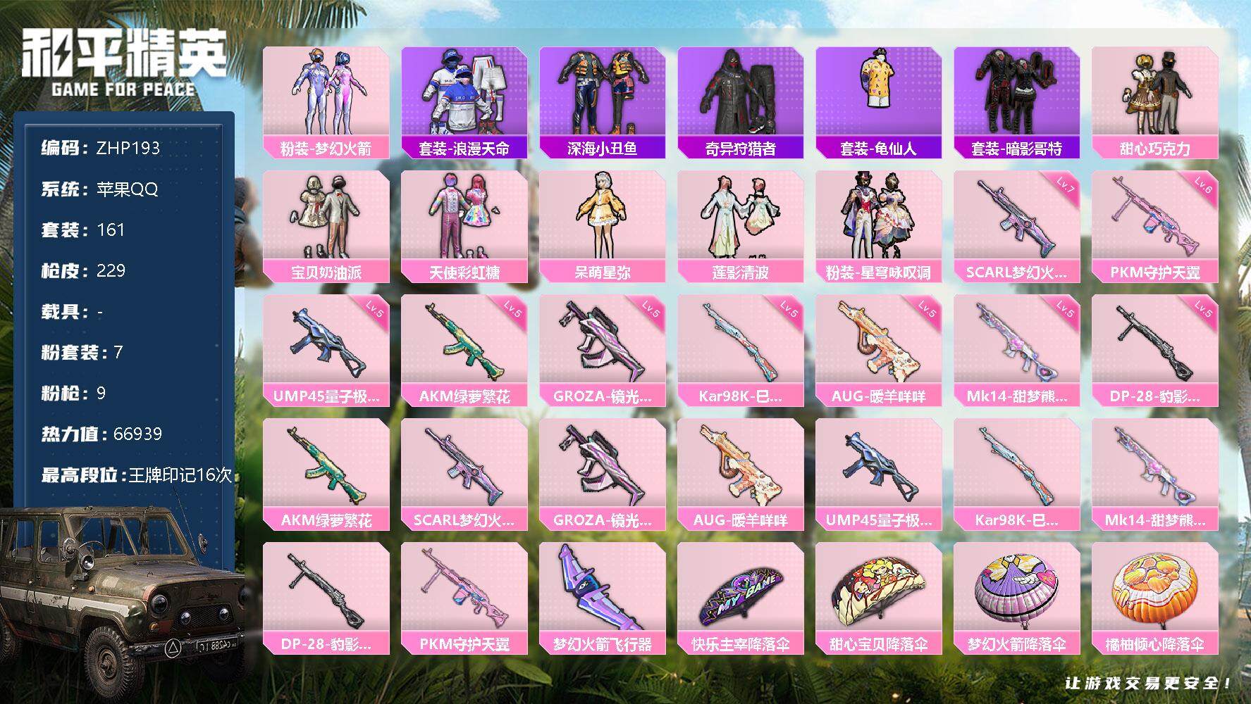 [12382758]【商品标题】:梦幻火箭巧克力三姐妹!苹果 手Q-7粉装-9特效枪-0载具-1粉色飞行器-66939热力值-16王牌印记-161套装-229枪皮 【热门品类】:粉装-梦幻火箭,套装-浪漫天命,套装-深海小丑鱼,套装-奇异狩猎者,套装-龟仙人,套装-暗影哥特 【粉色套装】:粉装-甜心巧克力,粉装-宝贝奶油派,粉装-天使彩虹糖,粉装-梦幻火箭,角色-呆萌星弥,粉装-莲影清波,粉装-星穹咏叹调 【粉色枪皮等级】:AKM-绿萝繁花(五级),SCAR-L-梦幻火箭(七级),GROZA-镜光银凌(五级),AUG-暖羊咩咩(五级),UMP45-量子极限(五级),Kar98K-巳巳如意(五级),Mk14-甜梦熊击(五级),DP-28-豹影疾电(五级),PKM-守护天翼(六级) 【粉色枪皮】:AKM-绿萝繁花,SCAR-L-梦幻火箭,GROZA-镜光银凌,AUG-暖羊咩咩,UMP45-量子极限,Kar98K-巳巳如意,Mk14-甜梦熊击,DP-28-豹影疾电,PKM-守护天翼 【粉色飞行器】:梦幻火箭飞行器 【粉色降落伞】:快乐主宰降落伞,甜心宝贝降落伞,梦幻火箭降落伞,橘柚倾心降落伞,筑梦精灵降落伞,炙焰牛王降落伞,垂柳戏鸭降落伞,荧海星豚降落伞,无垠阁降落伞 【稀有套装】:套装-龟仙人,套装-巳巳如意,套装-糖糖葫芦,套装-青团波波,套装-棉花软糖,角色-怀庆长公主,角色-俏兔智灵,套装-燕燕于飞,套装-鱼渊荷华,套装-镭金极速,角色-海琴烟,角色-糖霜甜心,套装-粉恋花,套装-紫幽梦,套装-蓝冰羽,套装-霓虹热舞,套装-彩虹兔,套装-云朵鹅,套装-雪绒豹,套装-蓝海鲸歌,套装-朱霞炽焰,套装-凌霄紫焰,套装-擎苍青焰,玩偶服-喜羊羊,角色-绯色魅影 【稀有枪皮】:AKM-彩虹符号,AKM-灼热熔岩,AKM-缤纷海域,AKM-虎虎生威,AKM-霓虹街区,AKM-龙的传人,M16A4-幻世战舞者,M16A4-甜心亚梦,M16A4-千金淑猫,SCAR-L-夜灯,SCAR-L-玉兔迎春,SCAR-L-红色方程式,M416-糯团青竹,M416-紫翼圣骑,M416-蓝色火焰,GROZA-彩虹符号,GROZA-影袭,GROZA-懵萌河马,GROZA-田园牧歌,GROZA-荧海星豚,AUG-天降萌叽,AUG-耀粉歌者,AUG-青春冒险家,QBZ-彩虹符号,QBZ-飞驰魅影,M762-天降萌叽,