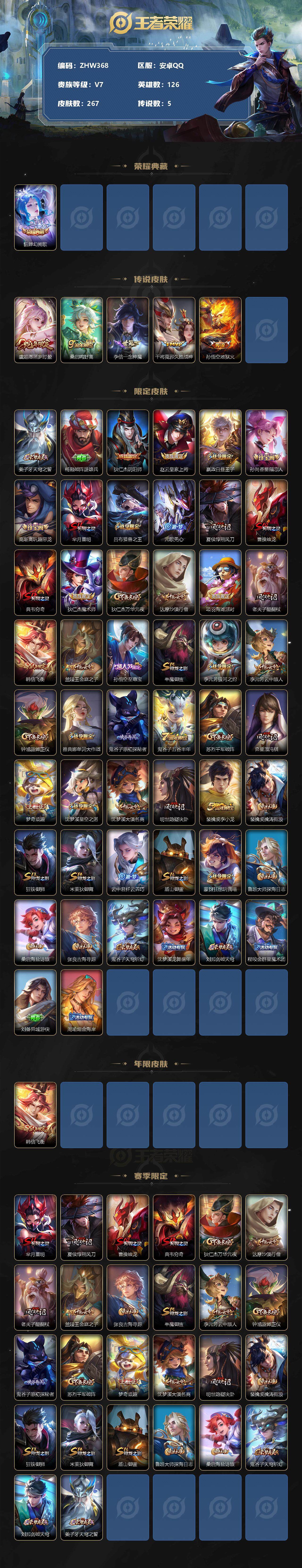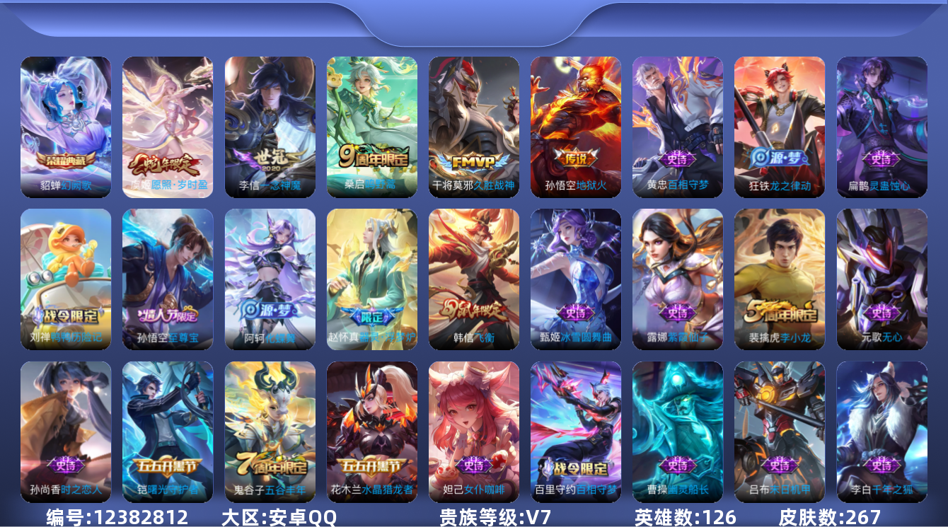 [12382812]【特价急出/详情看图】:安卓Q-V7-至尊星耀II段位-126英雄-267皮肤-1典藏-5传说-57史诗