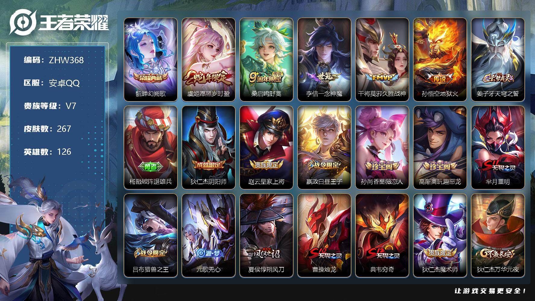 [12382812]【特价急出/详情看图】:安卓Q-V7-至尊星耀II段位-126英雄-267皮肤-1典藏-5传说-57史诗 【英雄全皮】:影全皮 【荣耀典藏】:貂蝉幻阙歌 【传说皮肤】:虞姬愿照岁时盈,桑启鸣野蒿,李信一念神魔,干将莫邪久胜战神,孙悟空地狱火 【限定皮肤】:姜子牙天穹之誓,杨戬破阵退雄兵,狄仁杰阴阳师,赵云皇家上将,嬴政白昼王子,孙尚香蔷薇恋人,高渐离玩趣恶龙,芈月重明,吕布猎兽之王,元歌无心,夏侯惇朔风刀,曹操烛龙,典韦穷奇,狄仁杰魔术师,狄仁杰万华元夜,达摩沙漠行僧,项羽海滩派对,老夫子醍醐杖,韩信飞衡,兰陵王金庭之子,孙悟空至尊宝,牛魔御旌,李元芳银河之约,李元芳云中旅人,钟馗驱傩正仪,雅典娜单词大作战,鬼谷子原初探秘者,鬼谷子五谷丰年,苏烈千军破阵,弈星混沌棋,梦奇顽趣,沈梦溪星空之诺,沈梦溪大漠名商,明世隐疑决卦,裴擒虎李小龙,裴擒虎擒涛扼浪,狂铁御狮,米莱狄御霄,云中君纤云弄巧,盾山御銮,蒙犽狂想玩偶喵,鲁班大师探海日志,桑启海盐诗旅,张良古海寻踪,鬼谷子天穹祈灯,沈梦溪龙舞盛年,刘邦剑破天穹,程咬金群星魔术团,刘备异域游侠,周瑜熔金海岸 【年限皮肤】:韩信飞衡 【赛季限定】:芈月重明,夏侯惇朔风刀,曹操烛龙,典韦穷奇,狄仁杰万华元夜,达摩沙漠行僧,老夫子醍醐杖,兰陵王金庭之子,张良古海寻踪,牛魔御旌,李元芳云中旅人,钟馗驱傩正仪,鬼谷子原初探秘者,苏烈千军破阵,弈星混沌棋,梦奇顽趣,沈梦溪大漠名商,明世隐疑决卦,裴擒虎擒涛扼浪,狂铁御狮,米莱狄御霄,盾山御銮,鲁班大师探海日志,桑启海盐诗旅,鬼谷子天穹祈灯,刘邦剑破天穹,姜子牙天穹之誓 【战令限定】:嬴政白昼王子,吕布猎兽之王,李元芳银河之约,雅典娜单词大作战,沈梦溪星空之诺,蒙犽狂想玩偶喵 【史诗皮肤】:露娜紫霞仙子,赵云皇家上将,赵云未来纪元,貂蝉圣诞恋歌,甄姬冰雪圆舞曲,王昭君偶像歌手,狄仁杰魔术师,宫本武藏鬼剑武藏,孙尚香蔷薇恋人,孙尚香水果甜心,嬴政摇滚巨星,妲己魅力维加斯,妲己女仆咖啡,墨子龙骑士,吕布圣诞狂欢,曹操幽灵船长,李白千年之狐,吕布末日机甲,张飞乱世虎臣,韩信白龙吟,孙悟空至尊宝,花木兰水晶猎龙者,刘邦德古拉伯爵,夏侯惇乘风破浪,小乔缤纷独角兽,兰陵王暗隐猎兽者,诸葛亮黄金分割率,雅典娜冰冠公主,安琪拉心灵骇客,百里守约特工魅影,铠曙光守护者,刘禅天才门将,李元芳逐浪之夏,白起星