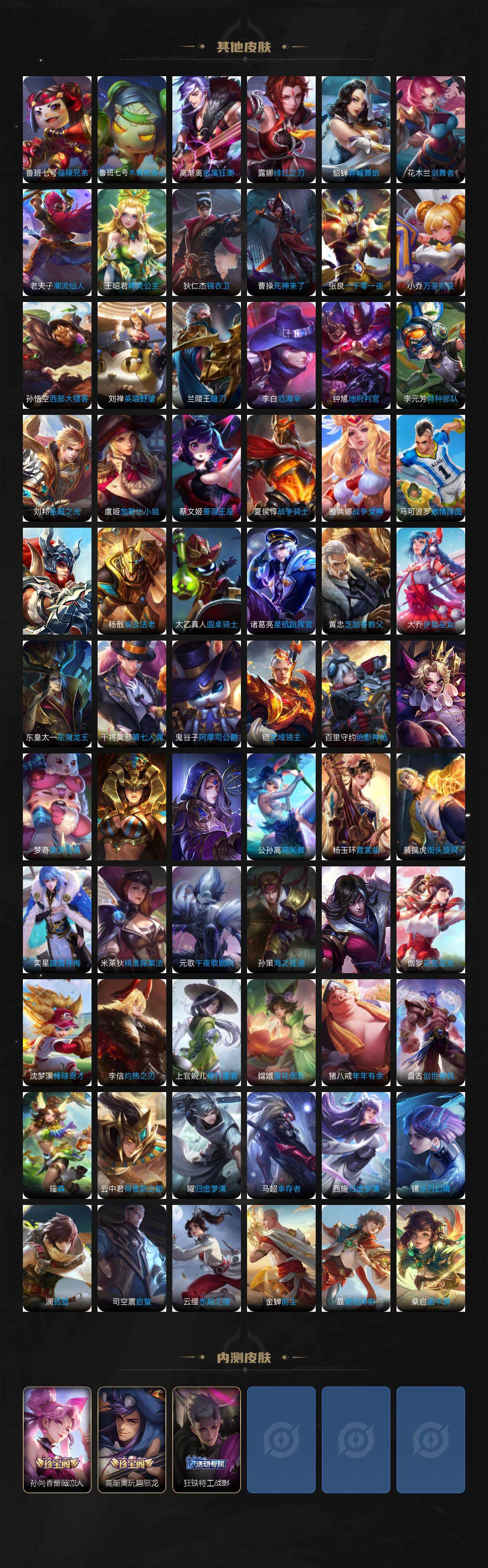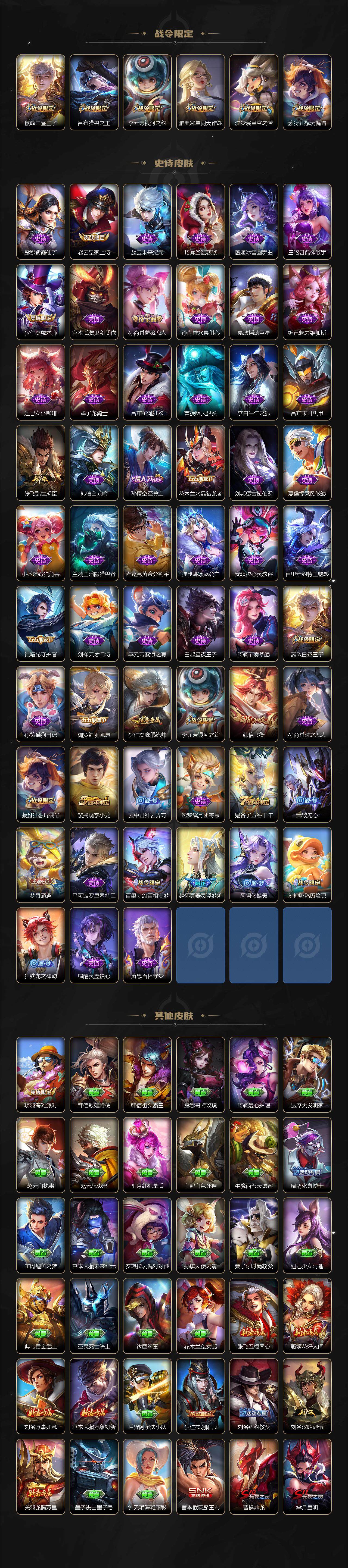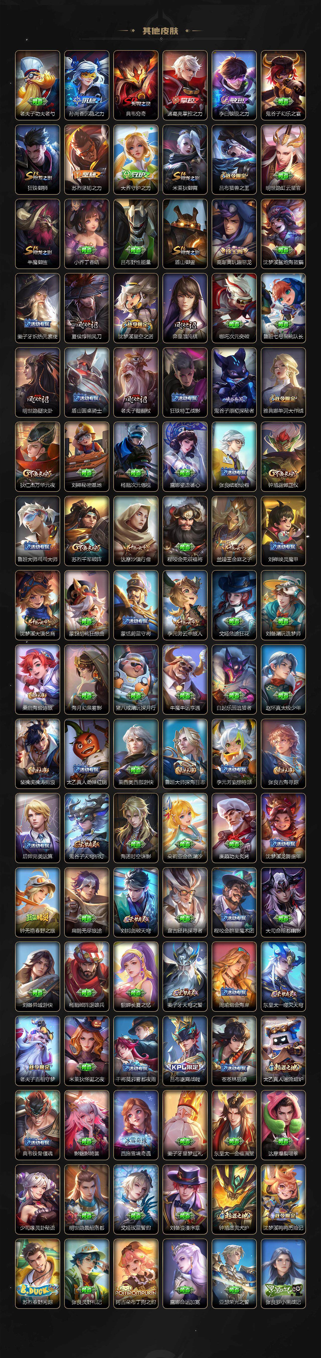 【限定皮肤】:姜子牙天穹之誓,杨戬破阵退雄兵,狄仁杰阴阳师,赵云皇家上将,嬴政白昼王子,孙尚香蔷薇恋人,高渐离玩趣恶龙,芈月重明,吕布猎兽之王,元歌无心,夏侯惇朔风刀,曹操烛龙,典韦穷奇,狄仁杰魔术师,狄仁杰万华元夜,达摩沙漠行僧,项羽海滩派对,老夫子醍醐杖,韩信飞衡,兰陵王金庭之子,孙悟空至尊宝,牛魔御旌,李元芳银河之约,李元芳云中旅人,钟馗驱傩正仪,雅典娜单词大作战,鬼谷子原初探秘者,鬼谷子五谷丰年,苏烈千军破阵,弈星混沌棋,梦奇顽趣,沈梦溪星空之诺,沈梦溪大漠名商,明世隐疑决卦,裴擒虎李小龙,裴擒虎擒涛扼浪,狂铁御狮,米莱狄御霄,云中君纤云弄巧,盾山御銮,蒙犽狂想玩偶喵,鲁班大师探海日志,桑启海盐诗旅,张良古海寻踪,鬼谷子天穹祈灯,沈梦溪龙舞盛年,刘邦剑破天穹,程咬金群星魔术团,刘备异域游侠,周瑜熔金海岸