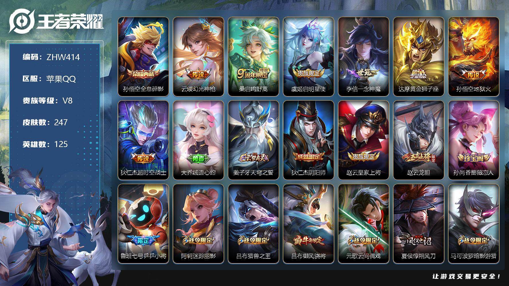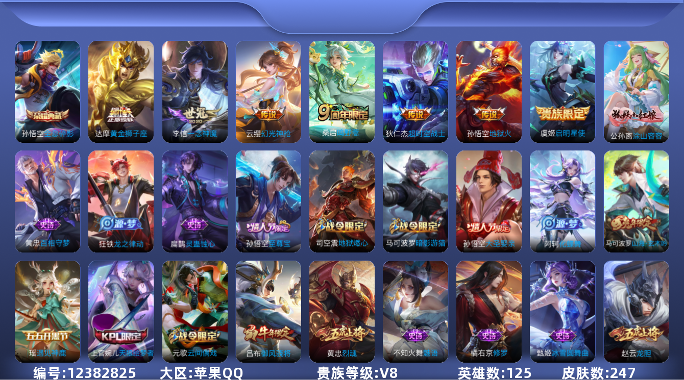 [12382825]【商品标题】:苹果Q-V8-永恒钻石I段位-125英雄-247皮肤-1典藏-7传说-71史诗