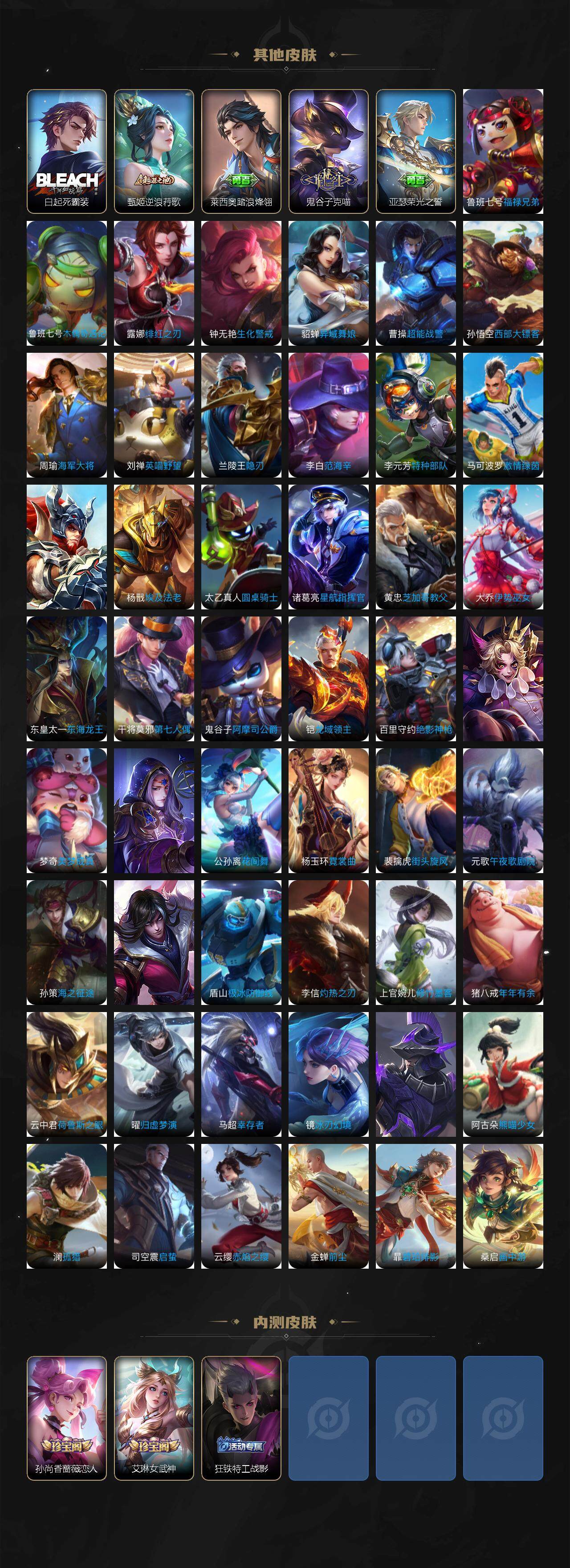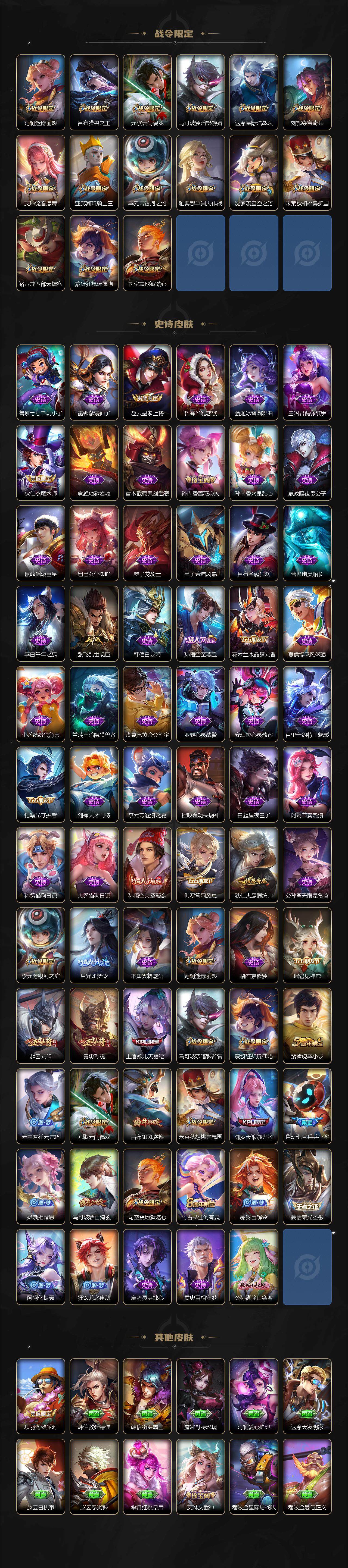 【限定皮肤】:大乔绒语心约,姜子牙天穹之誓,狄仁杰阴阳师,赵云皇家上将,赵云龙胆,孙尚香蔷薇恋人,鲁班七号乒乒小将,阿轲迷踪丽影,吕布猎兽之王,吕布御风骁将,元歌云间偶戏,夏侯惇朔风刀,马可波罗暗影游猎,马可波罗山海玄木吟,狄仁杰魔术师,狄仁杰万华元夜,达摩星际陆战队,达摩沙漠行僧,项羽海滩派对,老夫子醍醐杖,程咬金演武夺筹,刘邦夺宝奇兵,亚瑟潮玩骑士王,孙悟空至尊宝,孙悟空大圣娶亲,后羿如梦令,李元芳银河之约,虞姬启明星使,钟馗驱傩正仪,雅典娜单词大作战,鬼谷子原初探秘者,黄忠烈魂,弈星混沌棋,沈梦溪星空之诺,明世隐疑决卦,裴擒虎李小龙,米莱狄胡桃异想国,云中君纤云弄巧,伽罗天狼溯光者,猪八戒西部大镖客,上官婉儿天狼绘梦者,嫦娥拒霜思,蒙犽狂想玩偶喵,鲁班大师探海日志,艾琳女武神,艾琳流音漫舞,司空震地狱燃心,阿古朵江河有灵,张良古海寻踪,蒙犽百解令,蒙恬荣光圣徽,鬼谷子天穹祈灯,刘邦剑破天穹,刘备异域游侠,周瑜熔金海岸