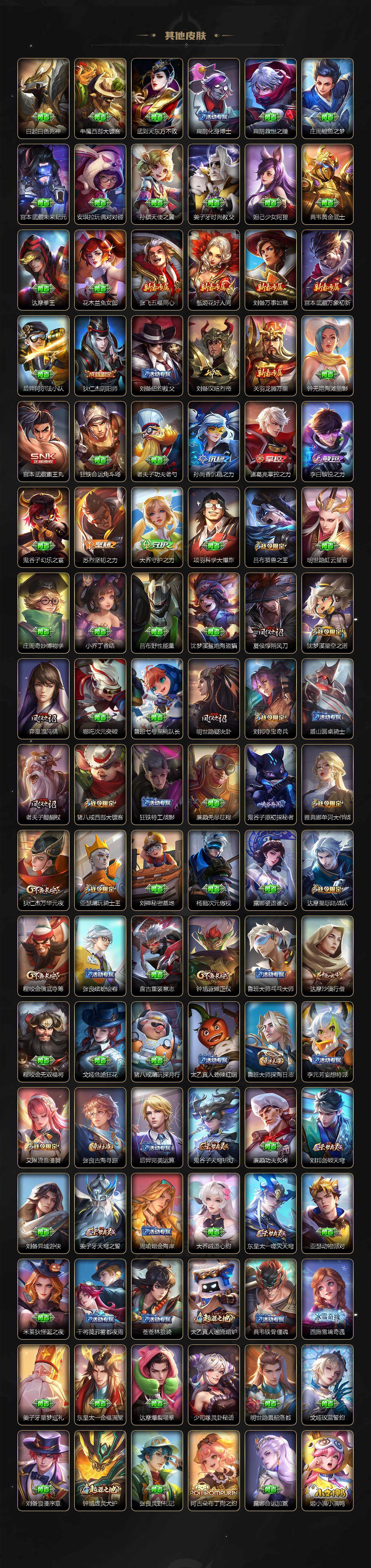 瑶遇见神鹿,伽罗箭羽风息,李元芳逐浪之夏,不知火舞魅语,公孙离无限星赏官,大乔猫狗日记,孙策猫狗日记,阿轲节奏热浪,露娜紫霞仙子,诸葛亮黄金分割率,王昭君偶像歌手,韩信白龙吟,鲁班七号电玩小子,橘右京修罗,墨子龙骑士,嬴政摇滚巨星,刘禅天才门将,白起星夜王子,安琪拉心灵骇客,程咬金功夫厨神,兰陵王暗隐猎兽者,曹操幽灵船长,宫本武藏鬼剑武藏,亚瑟心灵战警,廉颇地狱岩魂,小乔缤纷独角兽,夏侯惇乘风破浪,花木兰水晶猎龙者,铠曙光守护者,墨子金属风暴,吕布圣诞狂欢,貂蝉圣诞恋歌,百里守约特工魅影,嬴政暗夜贵公子,嫦娥拒霜思,李白千年之狐,蒙犽百解令