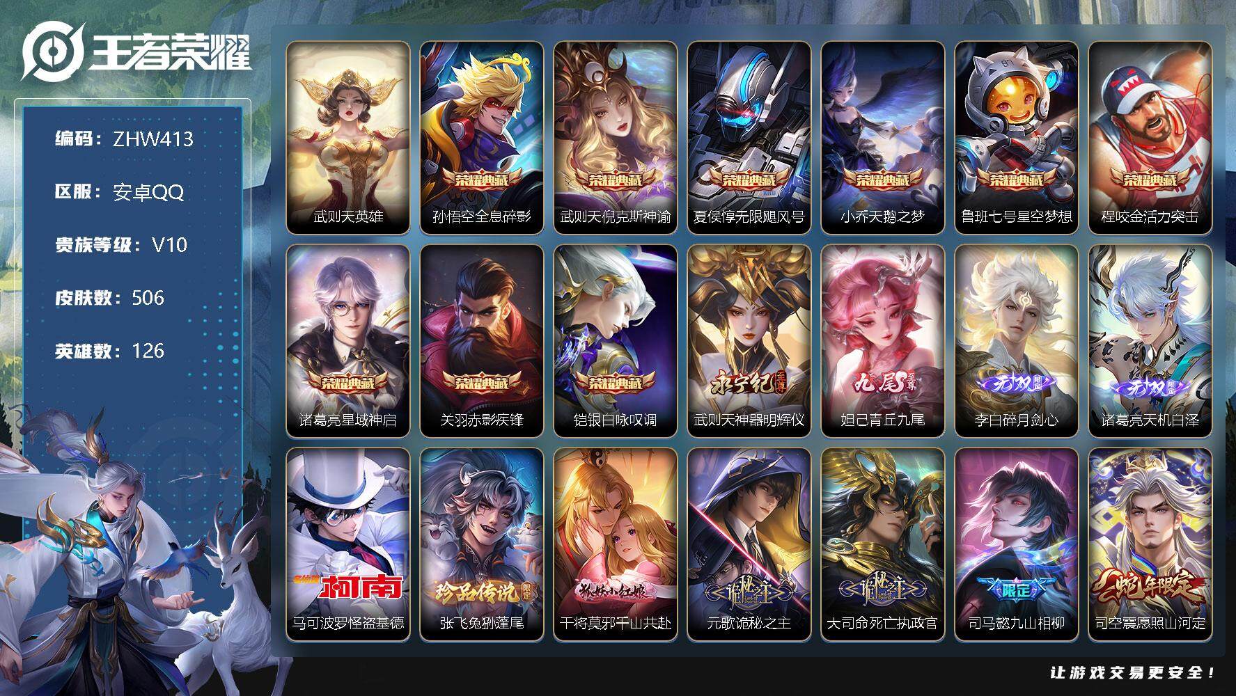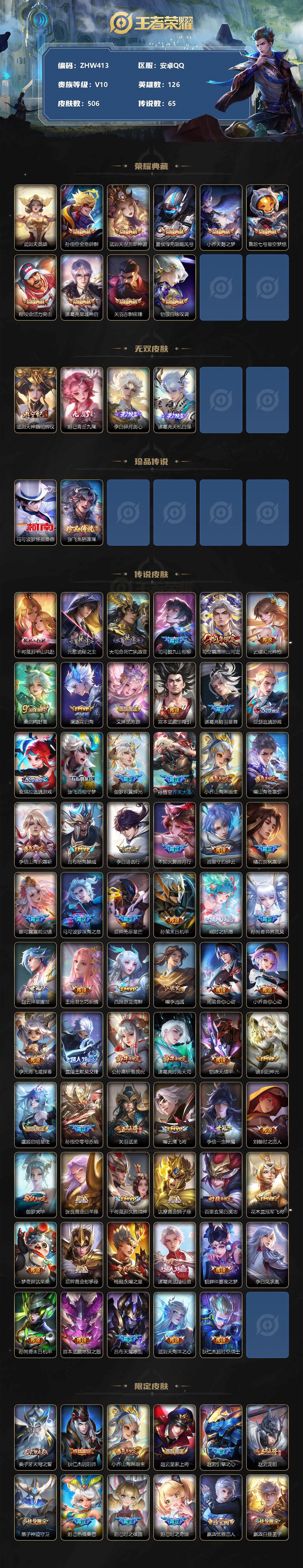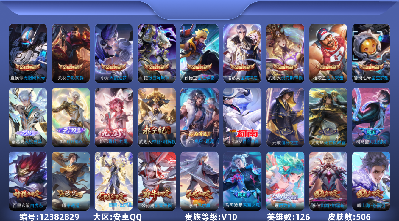 [12382829]【特价急出/详情看图】:安卓Q-V10-至尊星耀IV段位-126英雄-506皮肤-9典藏-4无双-2珍品传说-65传说-170史诗