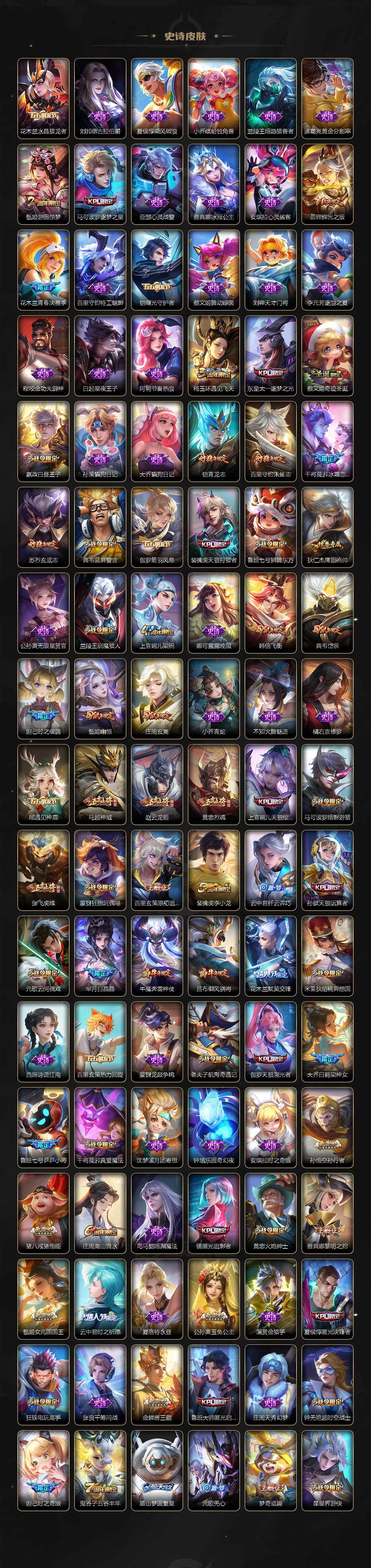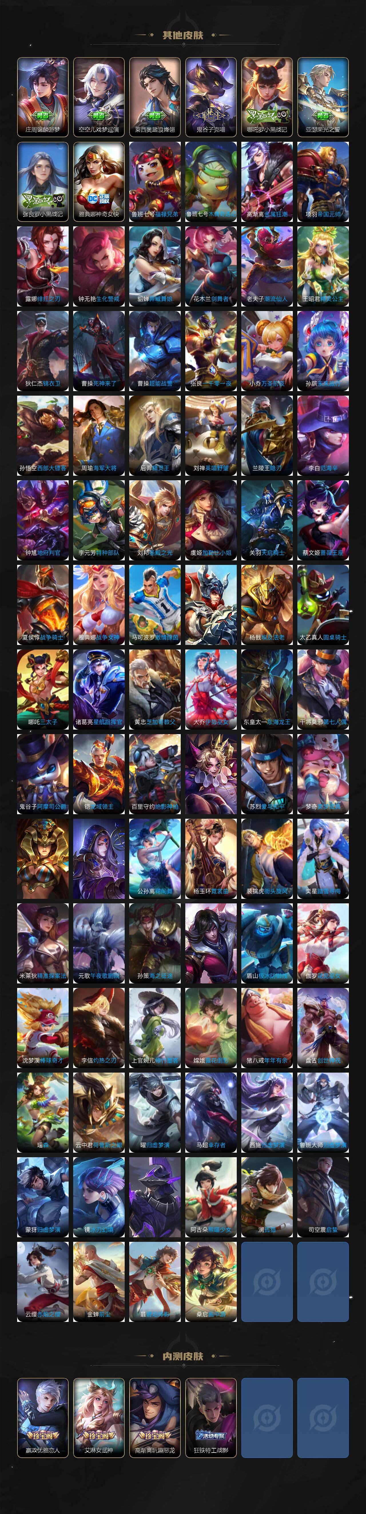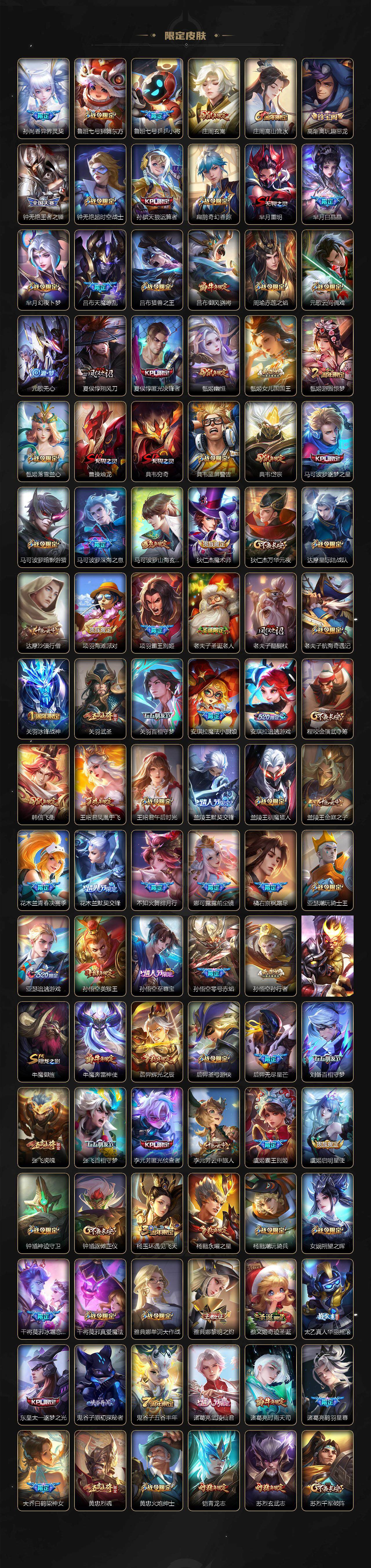 关羽冰锋战神,裴擒虎李小龙,上官婉儿梁祝,牛魔奔雷神使,公孙离祈雪灵祝,吕布御风骁将,诸葛亮时雨天司,赵云龙胆,关羽武圣,黄忠烈魂,张飞虎魄,马超神威,后羿辉光之辰,庄周玄嵩,典韦岱宗,甄姬幽恒,韩信飞衡,伽罗太华,裴擒虎天狼狩猎者,孙膑天狼运算者,上官婉儿天狼绘梦者,伽罗天狼溯光者,马可波罗逐梦之星,东皇太一逐梦之光,铠青龙志,百里玄策白虎志,苏烈玄武志,百里守约朱雀志,王昭君凤凰于飞,项羽霸王别姬,虞姬霸王别姬,花木兰默契交锋,兰陵王默契交锋,孙悟空至尊宝,雅典娜神奇女侠,妲己热情桑巴,干将莫邪冰霜恋舞曲,花木兰青春决赛季,蔡文姬奇迹圣诞,妲己时之彼端,芈月白晶晶,安琪拉魔法小厨娘,赵云引擎之心,孙悟空美猴王,鲁班七号乒乒小将,大乔白鹤梁神女,猪八戒猪悟能,孙尚香异界灵契,老夫子圣诞老人,孙悟空孙行者,甄姬女儿国国王,镜匿光追影者,云中君时之祈愿,瑶时之祈愿,公孙离玉兔公主,夏侯惇匿光决锋者,后羿无尽星芒,马可波罗深海之息,金蝉唐三藏,娜可露露前尘镜,橘右京枫霜尽,鲁班大师匿光启智者,妲己时之奇旅,不知火舞绯月行,盾山梦圆繁星,李白诗剑行,马可波罗山海·玄木吟,盘古冰霜神祇,瑶山海·碧波行,桑启鸣野蒿,司空震愿照·山河定