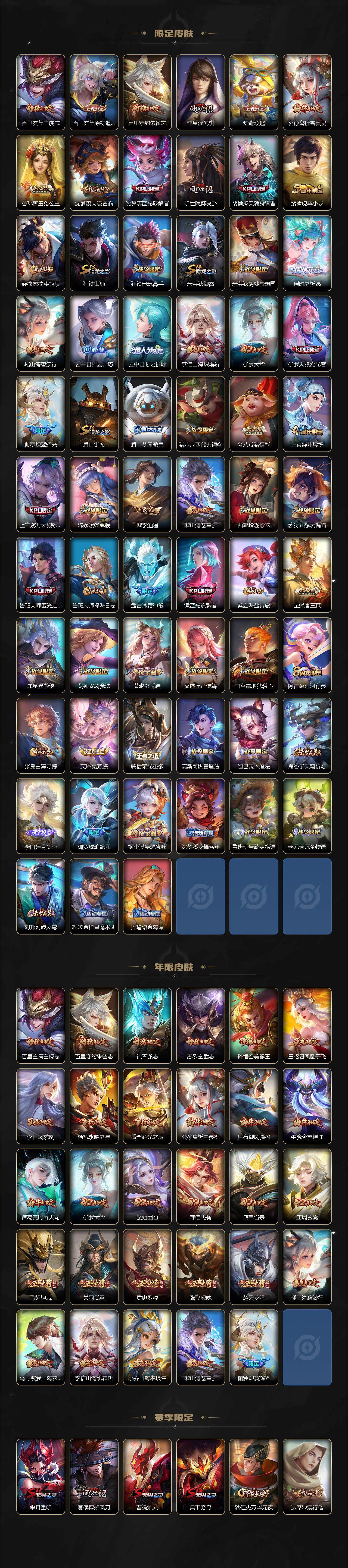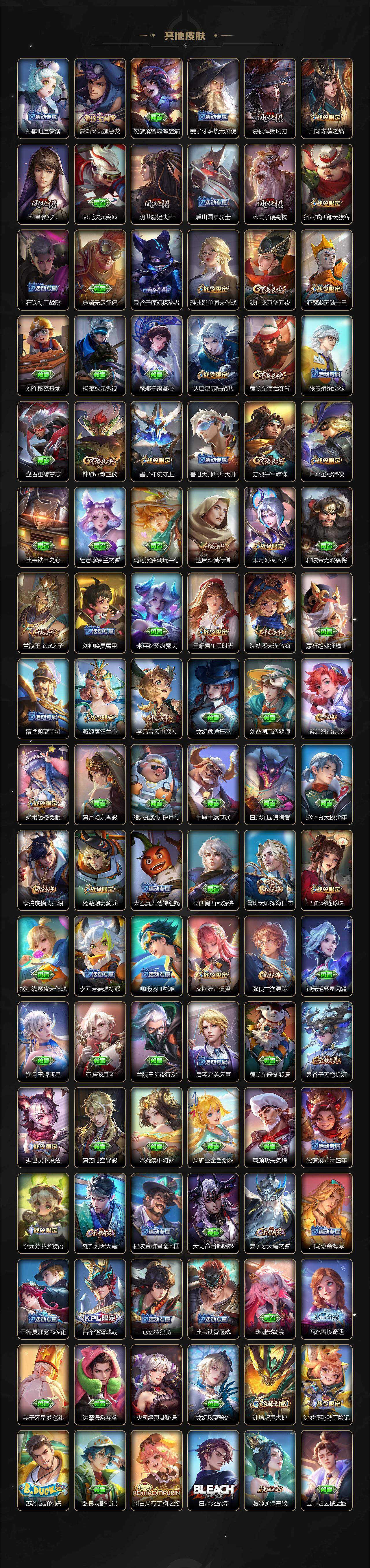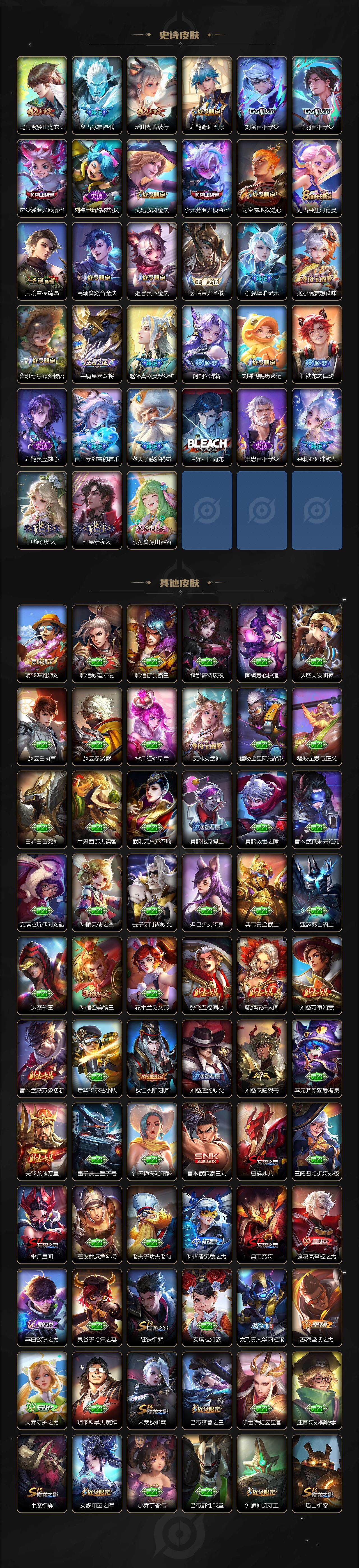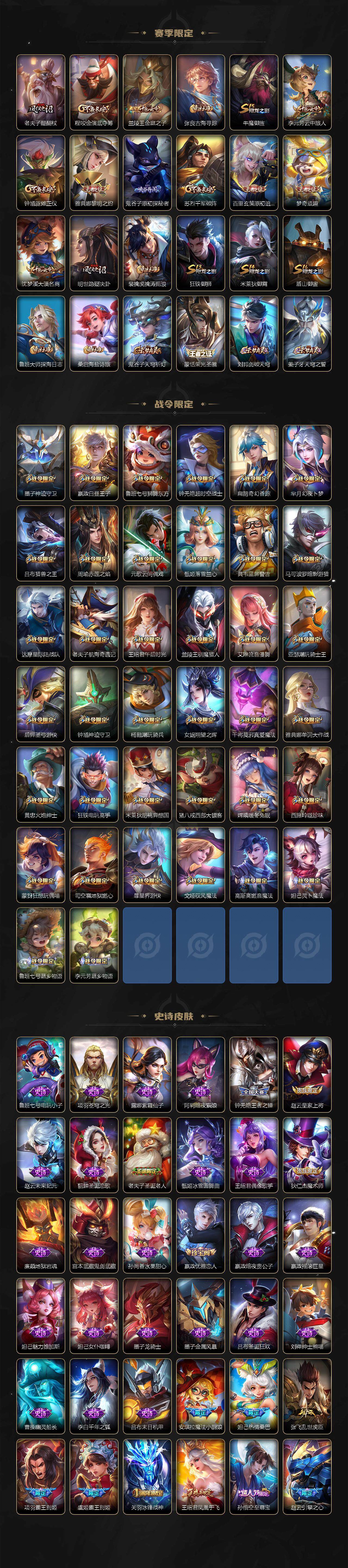 关羽冰锋战神,裴擒虎李小龙,上官婉儿梁祝,牛魔奔雷神使,公孙离祈雪灵祝,吕布御风骁将,诸葛亮时雨天司,赵云龙胆,关羽武圣,黄忠烈魂,张飞虎魄,马超神威,后羿辉光之辰,庄周玄嵩,典韦岱宗,甄姬幽恒,韩信飞衡,伽罗太华,裴擒虎天狼狩猎者,孙膑天狼运算者,上官婉儿天狼绘梦者,伽罗天狼溯光者,马可波罗逐梦之星,东皇太一逐梦之光,铠青龙志,百里玄策白虎志,苏烈玄武志,百里守约朱雀志,王昭君凤凰于飞,项羽霸王别姬,虞姬霸王别姬,花木兰默契交锋,兰陵王默契交锋,孙悟空至尊宝,雅典娜神奇女侠,妲己热情桑巴,干将莫邪冰霜恋舞曲,花木兰青春决赛季,蔡文姬奇迹圣诞,妲己时之彼端,芈月白晶晶,安琪拉魔法小厨娘,赵云引擎之心,孙悟空美猴王,鲁班七号乒乒小将,大乔白鹤梁神女,猪八戒猪悟能,孙尚香异界灵契,老夫子圣诞老人,孙悟空孙行者,甄姬女儿国国王,镜匿光追影者,云中君时之祈愿,瑶时之祈愿,公孙离玉兔公主,夏侯惇匿光决锋者,后羿无尽星芒,马可波罗深海之息,金蝉唐三藏,娜可露露前尘镜,橘右京枫霜尽,鲁班大师匿光启智者,妲己时之奇旅,不知火舞绯月行,盾山梦圆繁星,李白诗剑行,马可波罗山海·玄木吟,盘古冰霜神祇,瑶山海·碧波行,桑启鸣野蒿,司空震愿照·山河定