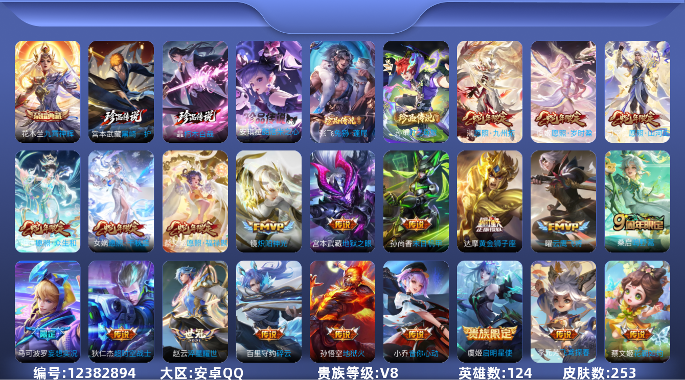 [12382894]【商品标题】:安卓Q-V8-最强王者段位-124英雄-251皮肤-1典藏-0珍品无双-0无双-5珍品传说-22传说-80史诗