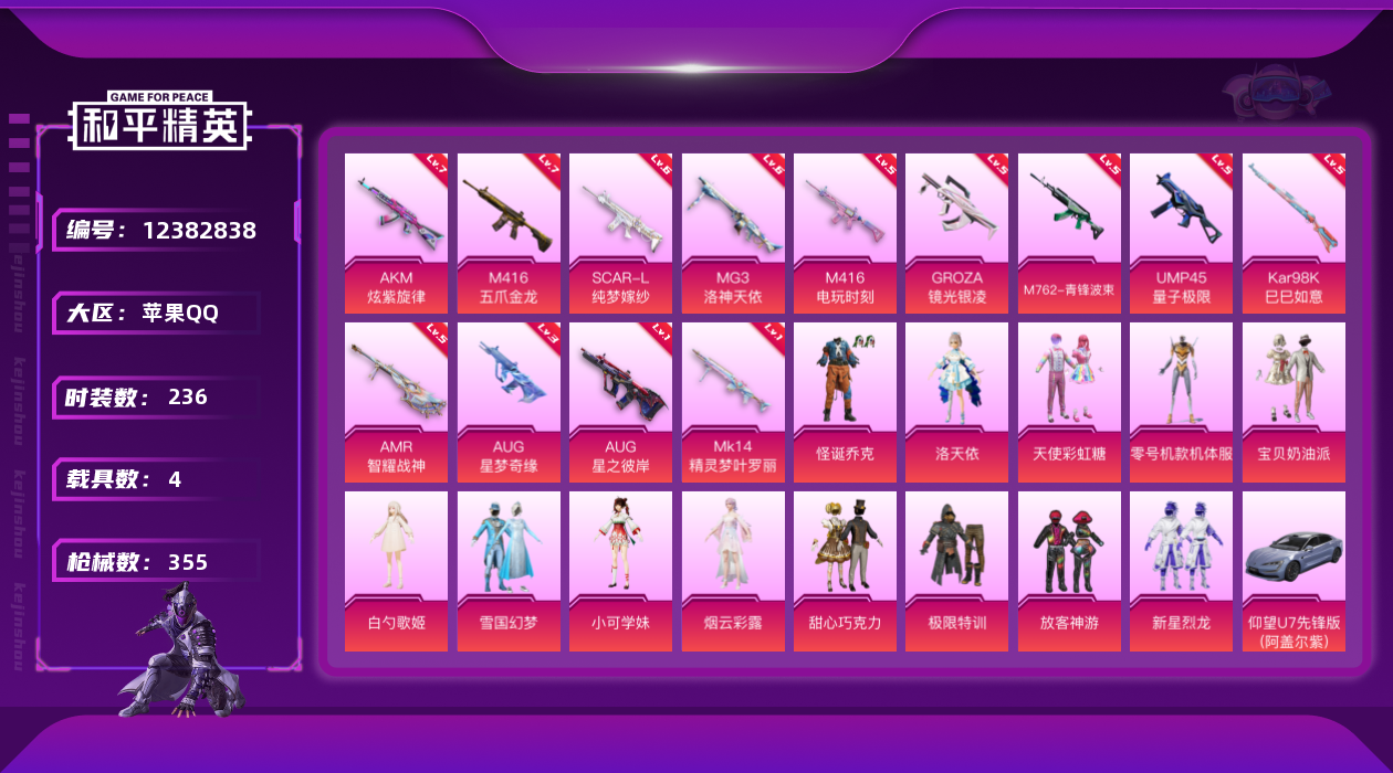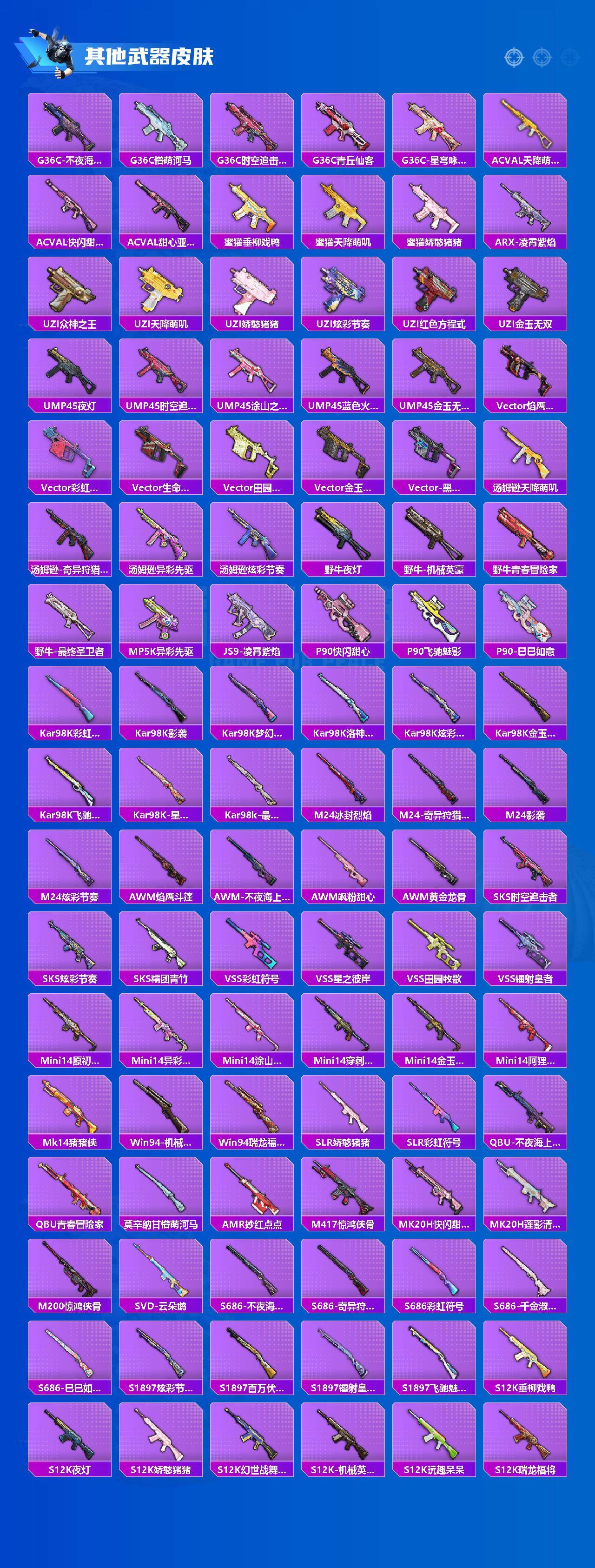 【粉色枪皮】:AKM-炫紫旋律,SCAR-L-纯梦嫁纱,M416-五爪金龙,M416-电玩时刻,GROZA-镜光银凌,AUG-星之彼岸,AUG-星梦奇缘,M762-青锋波束,UMP45-量子极限,Vector-最终圣卫者,汤姆逊-热量炸弹,AKS-74U-星穹咏叹调,P90-魔童闹海 敖丙,Kar98K-巳巳如意,Mk14-精灵梦叶罗丽,Mk14-甜梦熊击,AMR-智耀战神,DP-28-豹影疾电,MG3-洛神天依,MG-