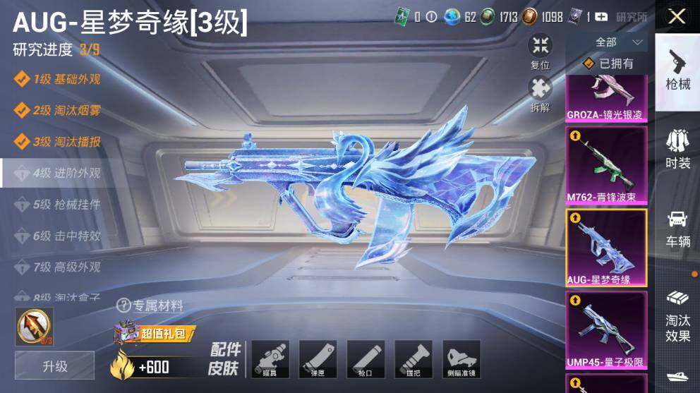 AKM-炫紫旋律,SCAR-L-纯梦嫁纱,M416-五爪金龙,M416-电玩时刻,GROZA-镜光银凌,AUG-星之彼岸,AUG-星梦奇缘,M762-青锋波束,UMP45-量子极限,Kar98K-巳巳如意,Mk14-精灵梦叶罗丽,MG3-洛神天依