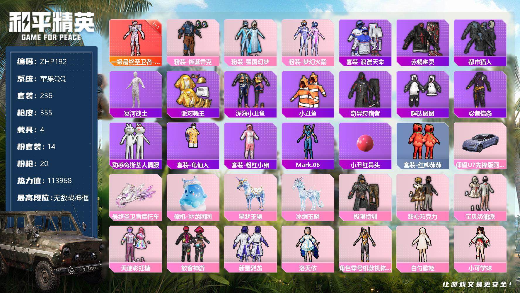 [12382838]【商品标题】:帕修斯一级!雪国幻梦怪诞乔克!老木乃伊 男神套装!3级星梦奇缘!苹果 手Q-无敌战神框-1神装-14粉装-20特效枪-4载具+1僚机-5粉色飞行器-113968热力值-19王牌印记-236套装-355枪皮