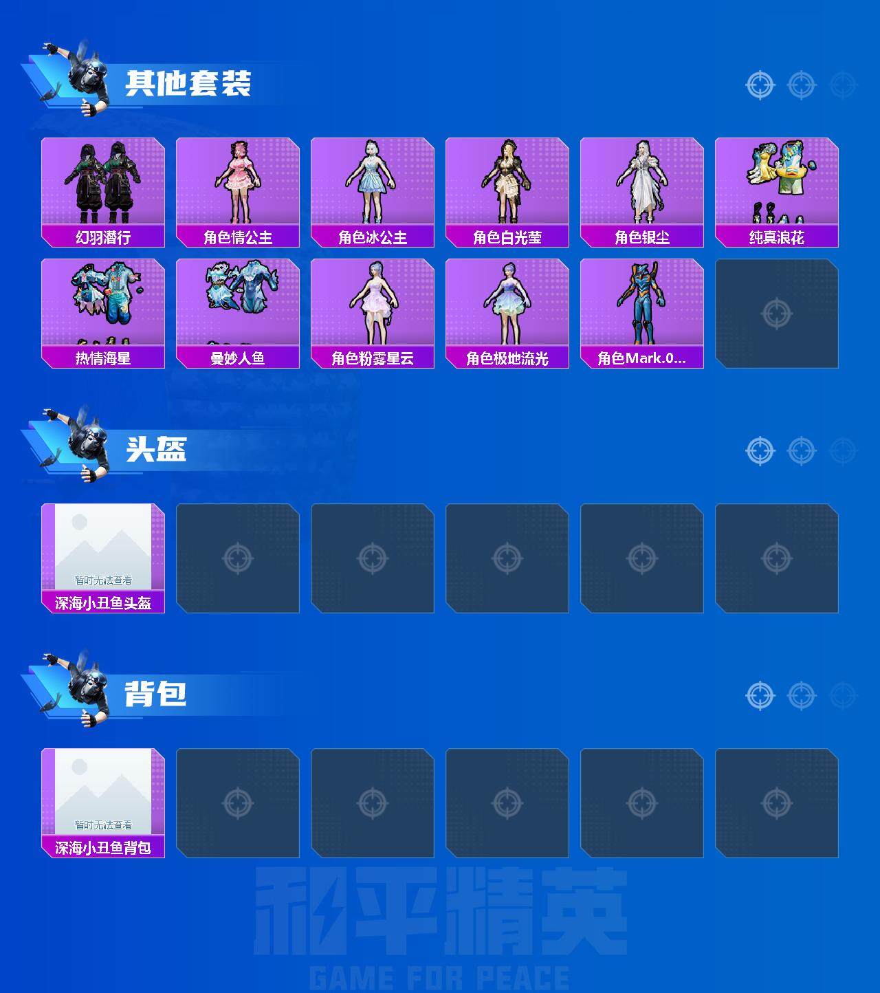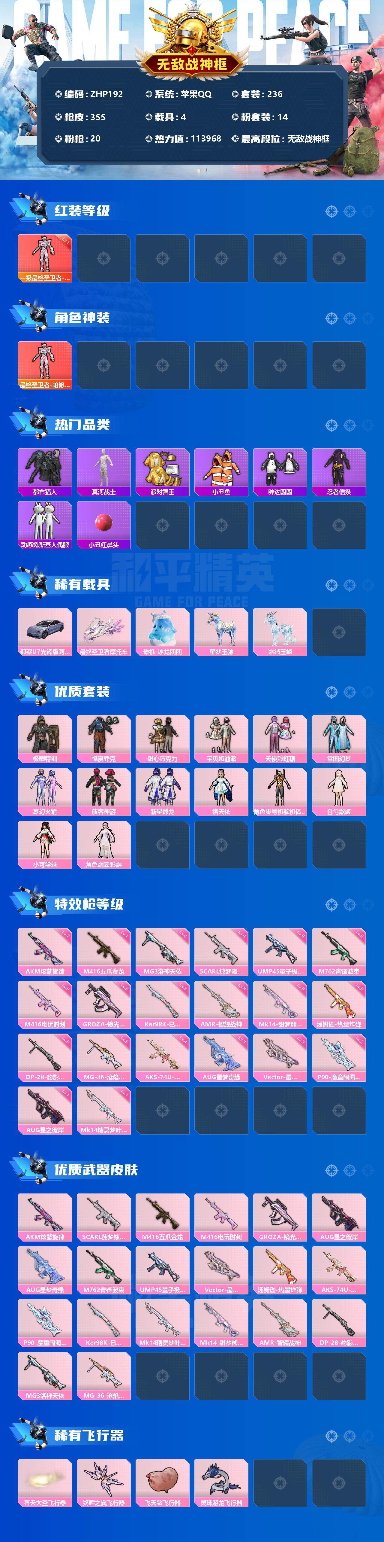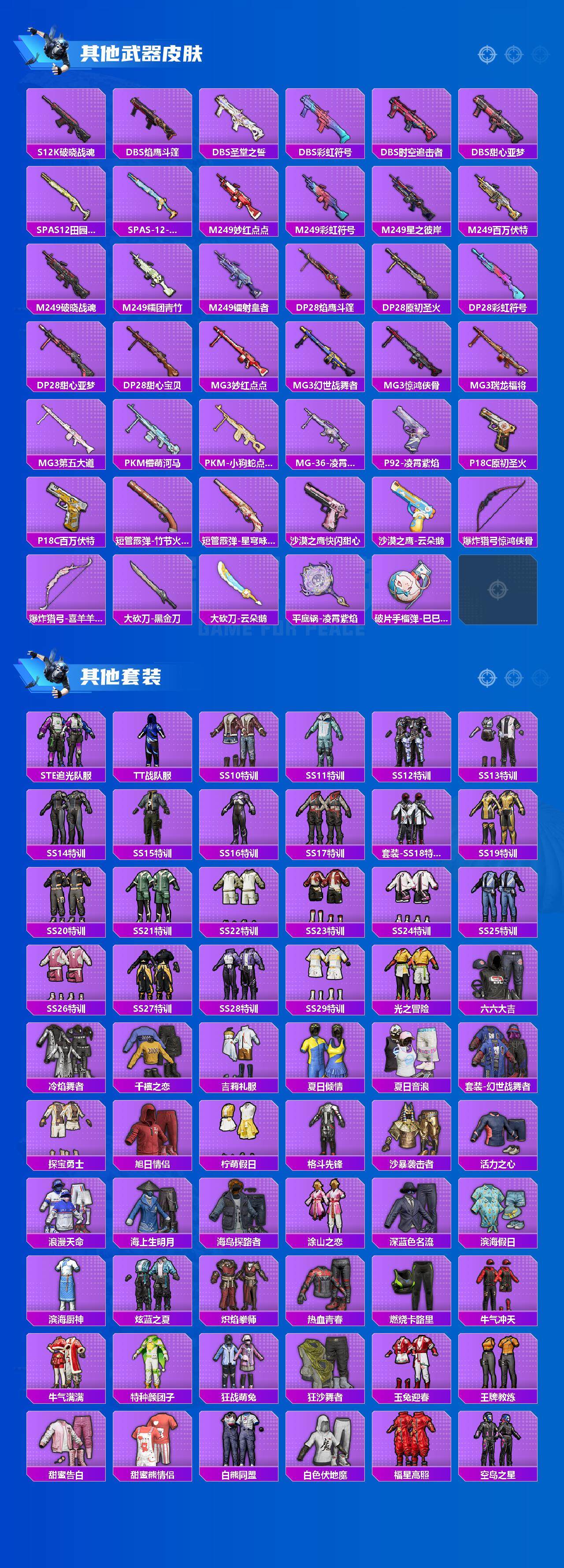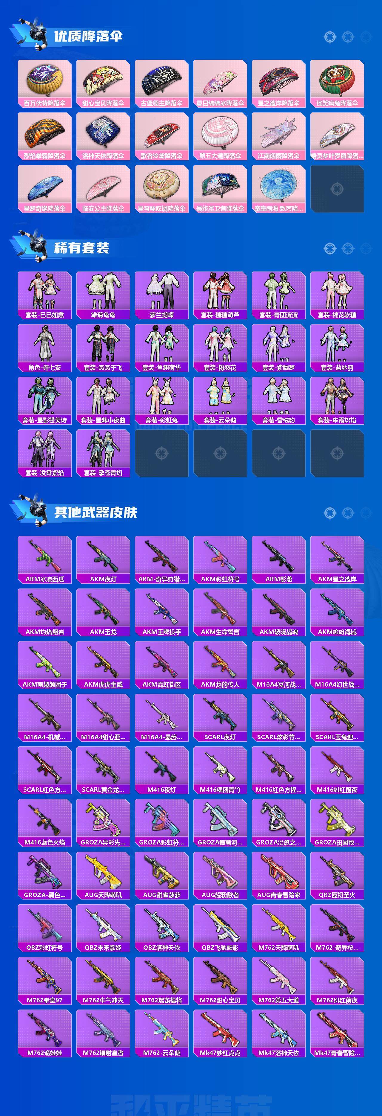 - [11528892]1粉装 4特效枪 10印记 可二次 可修改实名 连体王者 身法装备:都市猎人,Mark.06(新蓝螳螂) 优质装备:都市猎人,GROZA-镜光银凌,AUG-暖羊咩咩,星穹咏叹调,Kar98K-巳巳如意 热门装扮:神秘黑猫,鹰眼刺客,都市猎人 稀有枪皮:DP-28-豹影疾电 五级特效枪:五级GROZA-镜光银凌,五级Kar98K-巳巳如意,五级DP-28-豹影疾电,五级AUG-暖羊咩咩 紫色装扮:SS22特训,SS23特训,娇憨猪猪,萌趣咩咩,SS21特训,SS31特训套装,六六大吉,冰川特警,冷焰舞者,北国孤狼,旭日情侣,SS30特训套装,SS33特训套装,顶瓜瓜,SS20特训,SS16特训,冰爽风暴,SS13特训,SS14特训,飞驰魅影,音速流光,极速竞梦,SS19特训,瑞龙福将,团圆交子,SS17特训,异彩先驱,缤纷焰火,SS18特训,都市魅力,酒红色名流,长空猛禽,雪山精英,霓虹极客,霓虹街区,青年教官,风暴特警,缤纷果语,荣耀,蓝彩潮人,蓝色守护者,虎虎生威吉莉,街头潮人,超能勇士,跃动心情,骑行爱好者,魅力单车,鹤鸣,麻辣教官,黄色伏地魔,黄色运动,黑色伏地魔,龙的传人,冰河战士,龙魂突击队,蝶变,香桃花海,极地朋克,极速红龙,柠萌假日,格斗先锋,海岛探路者,深蓝色名流,滨海假日,幻影武者,夏日音浪,幻世战舞者,怒火燎原,战地督导,探宝勇士,滨海厨神,绮丽涂鸦,疯狂小兔子,白色伏地魔,破晓战魂,破蛋小黄鸡,甜蜜告白,福星高照,空岛之星,空投萌叽,竞技勇士朋克,甜蜜熊情侣,王牌教练,牛气冲天,灰色格斗者,灼焰舞者,炫蓝之夏,牛气满满,猛禽,猎鹰,小熊娃娃,雏菊兔兔,萝兰蝴蝶,SS29特训,达芬奇,米开朗基罗,湖畔霞光,星途旅人,纯真浪花,热情海星,曼妙人鱼,SS28特训,Mark.06(新蓝螳螂),异域银装,鱼渊荷华,玉兔迎春,燕燕于飞,巳巳如意,森林游猎者,竞技名士,街头风暴,深海梦境,惊鸿侠骨,SS24特训(SS24特训套装),SS25特训,锦衣飞扬,粉红小猪,SS27特训,萌趣绒叽,华灯初上,SS26特训,智谋强哥,SS6特训,SS7特训,淡雅花蕊,SS8特训,SS12特训,SS9特训,耀粉歌者,SS32特训服(SS32特训套装),绯格组合,恋语绒绒,漫步者,蓝调潮人,冰冻风暴,光之冒险 优质战备:星途旅人降落伞,闲梦青缨降落伞,春暖花开降落伞,暗夜