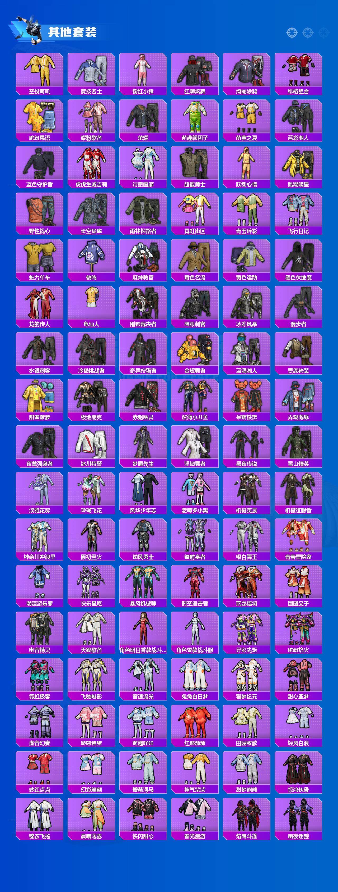 【粉色套装】:粉装-极限特训,粉装-怪诞乔克,粉装-甜心巧克力,粉装-宝贝奶油派,粉装-天使彩虹糖,粉装-雪国幻梦,粉装-梦幻火箭,粉装-放客神游,粉装-新星烈龙,角色-洛天依,角色-零号机款机体服,角色-白勺歌姬,角色-小可学妹,角色-烟云彩露