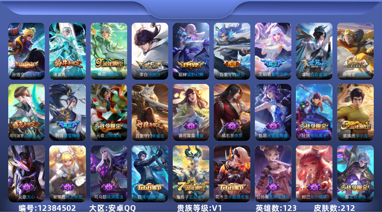 [12384502]【特价急出/详情看图】:安卓Q-V0-尊贵铂金IV段位-123英雄-212皮肤-1典藏-7传说-48史诗
