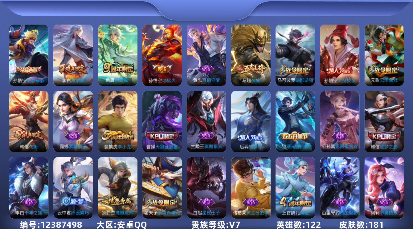 [12387498]【商品标题】:安卓Q-V7-至尊星耀V段位-122英雄-181皮肤-1典藏-0珍品无双-0无双-0珍品传说-3传说-41史诗