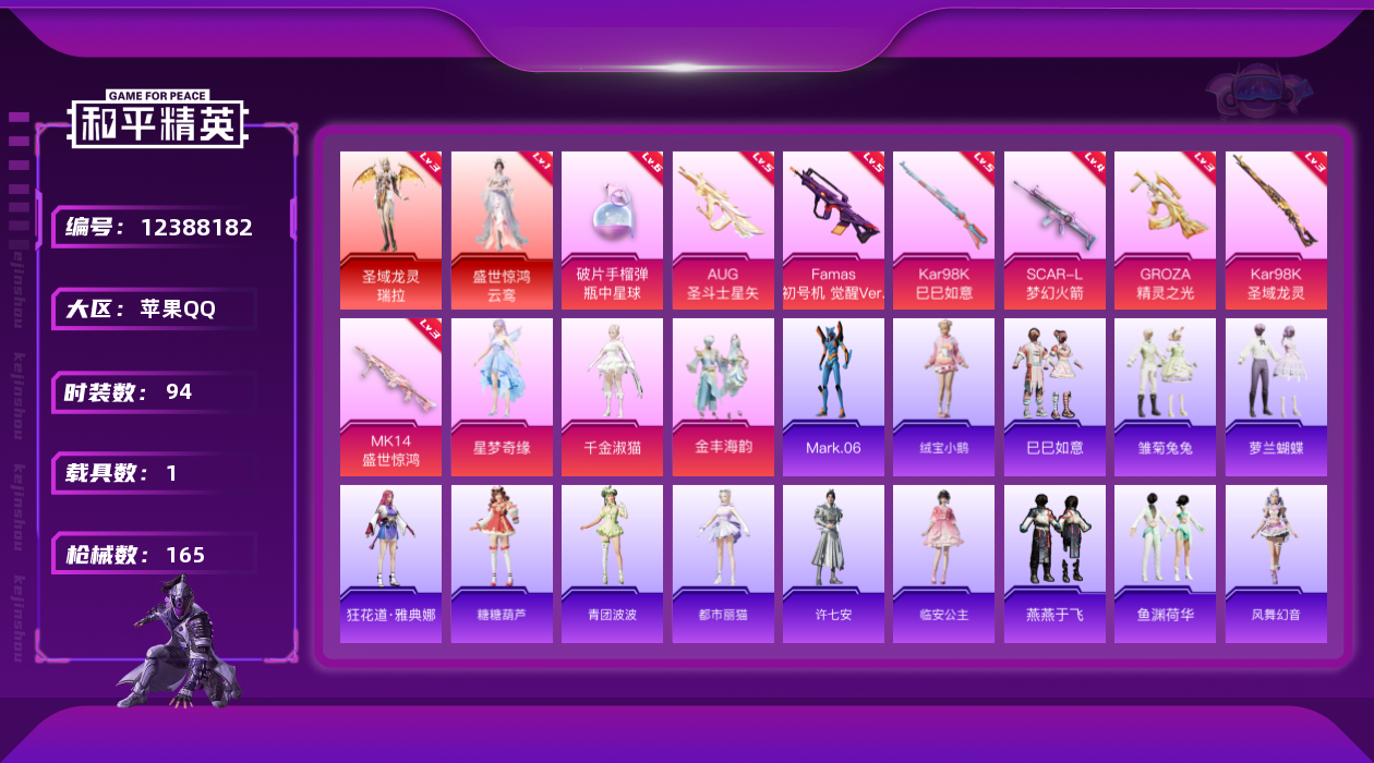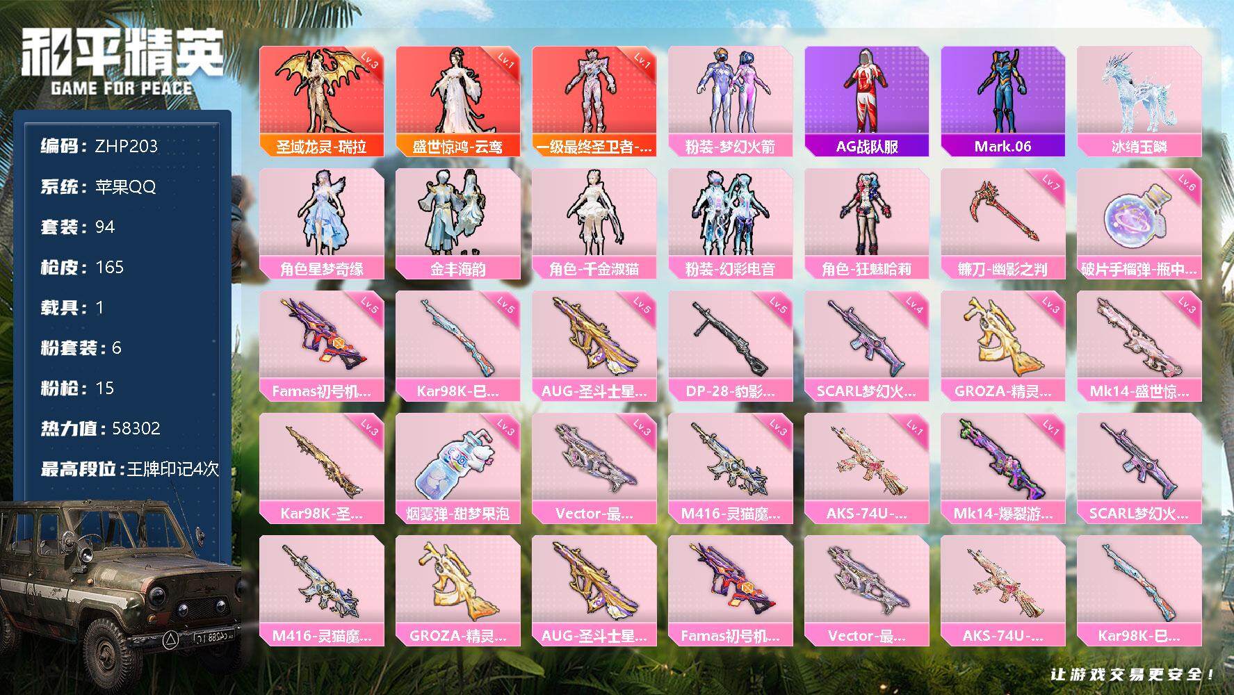 [12388182]【特价急出/详情看图】:苹果 手Q-3神装-6粉装-15特效枪-1载具-9粉色飞行器-58302热力值-4王牌印记-94套装-165枪皮
