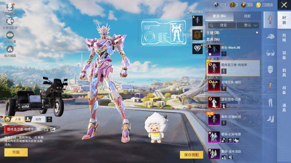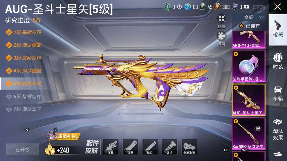 【粉色枪皮等级】:SCAR-L-梦幻火箭(四级),M416-灵猫魔法师(三级),GROZA-精灵之光(三级),AUG-圣斗士星矢(五级),Famas-初号机 觉醒Ver.(五级),Vector-最终圣卫者(三级),AKS-74U-星穹咏叹调(一级),Kar98K-巳巳如意(五级),Kar98K-圣域龙灵(三级),Mk14-盛世惊鸿(三级),Mk14-爆裂游戏(一级),DP-28-豹影疾电(五级),镰刀-幽影之判(七级),烟雾弹-甜梦果泡(三级),破片手榴弹-瓶中星球(六级)