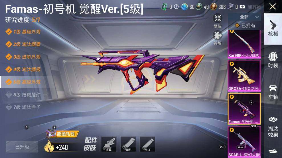 SCAR-L-梦幻火箭,GROZA-精灵之光,Famas-觉醒初号机,Kar98K-巳巳如意,Kar98K-圣域龙灵,Mk14-盛世惊鸿