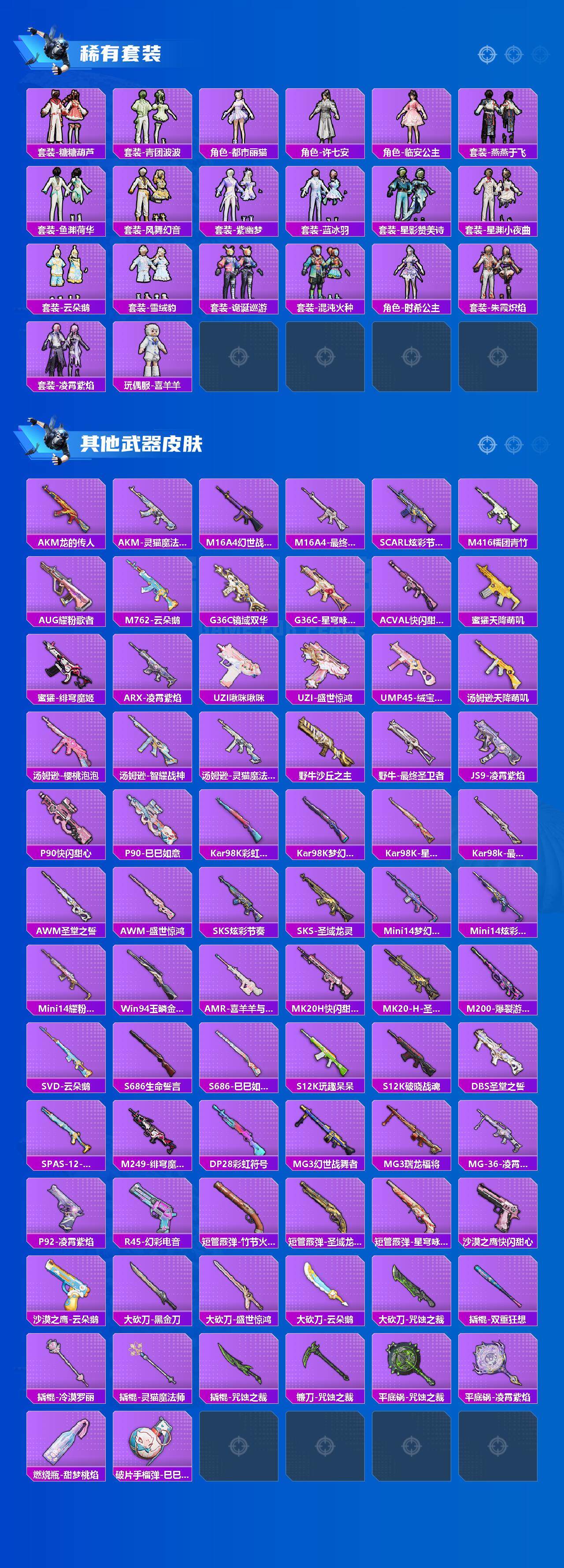【粉色枪皮】:SCAR-L-梦幻火箭,M416-灵猫魔法师,GROZA-精灵之光,AUG-圣斗士星矢,Famas-初号机 觉醒Ver.,Vector-最终圣卫者,AKS-74U-星穹咏叹调,Kar98K-巳巳如意,Kar98K-圣域龙灵,Mk14-盛世惊鸿,Mk14-爆裂游戏,DP-28-豹影疾电,镰刀-幽影之判,烟雾弹-甜梦果泡,破片手榴弹-瓶中星球