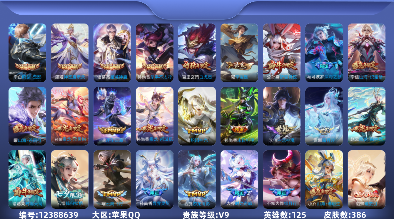 [12388639]【商品标题】:苹果Q-V9-至尊星耀II段位-125英雄-386皮肤-4典藏-0珍品无双-0无双-0珍品传说-36传说-118史诗