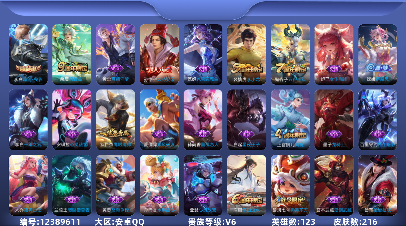 [12389611]【商品标题】:安卓Q-V6-至尊星耀IV段位-123英雄-212皮肤-1典藏-0珍品无双-0无双-0珍品传说-1传说-41史诗