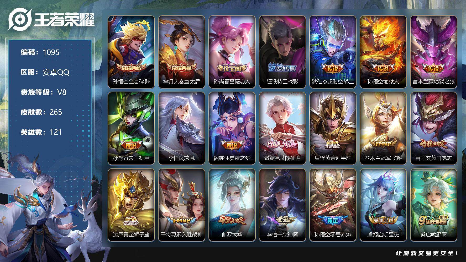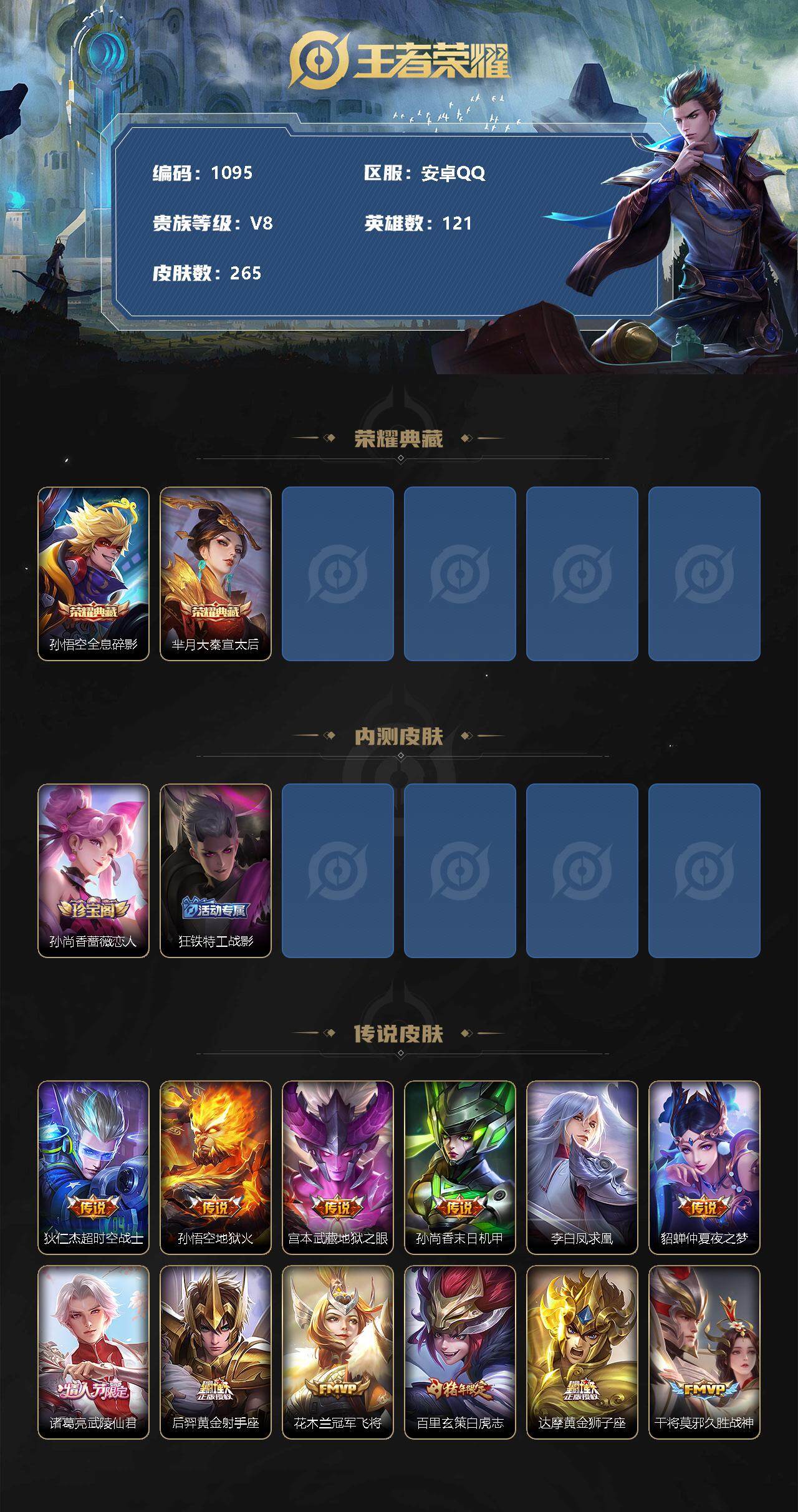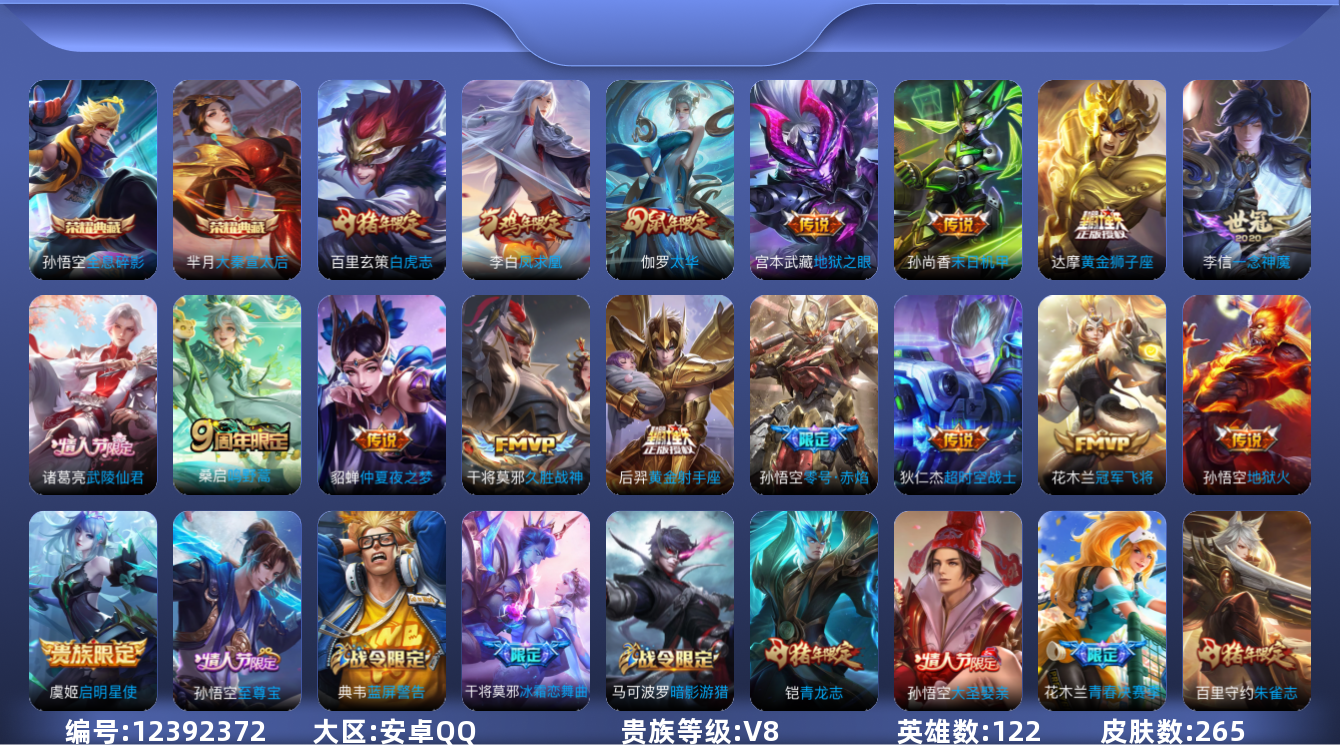 [12392372]【商品标题】:安卓Q-V3-至尊星耀III段位-121英雄-265皮肤-2典藏-0珍品无双-0无双-0珍品传说-17传说-66史诗
