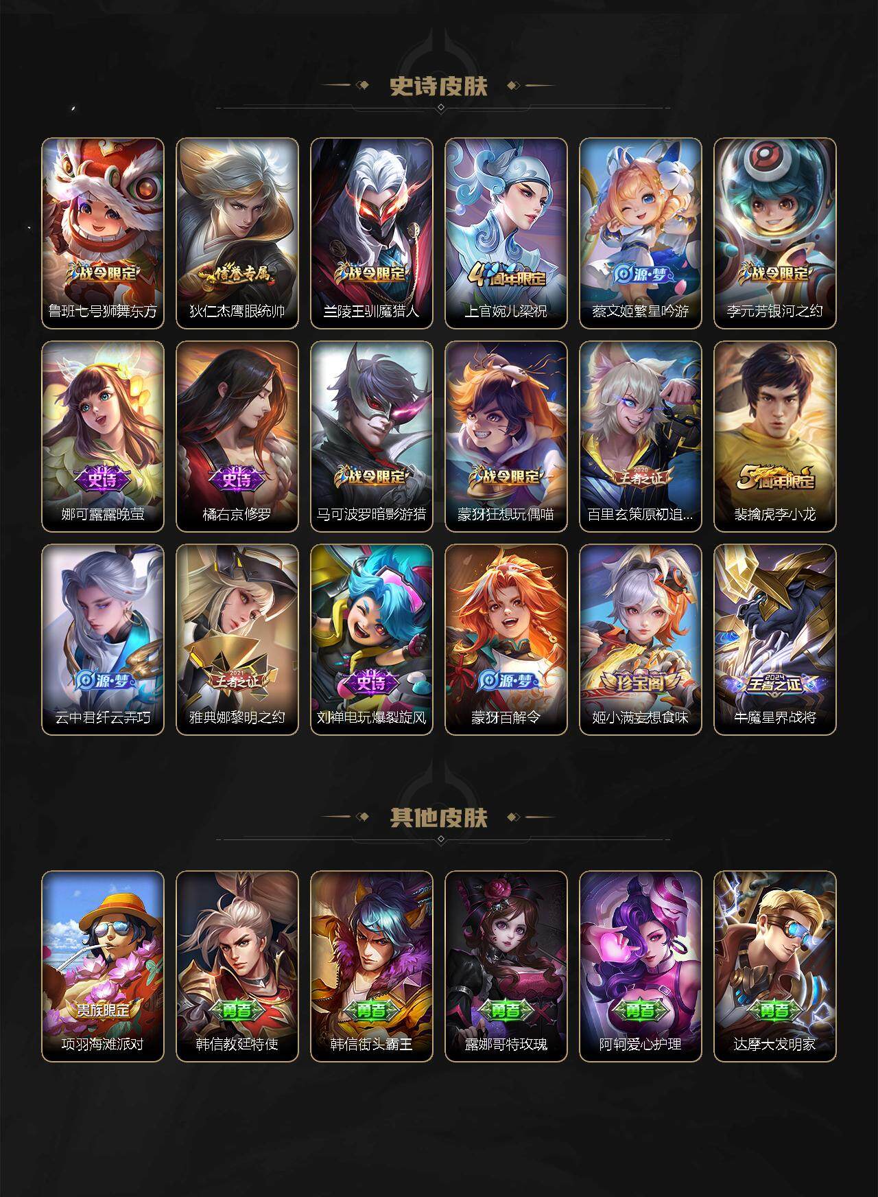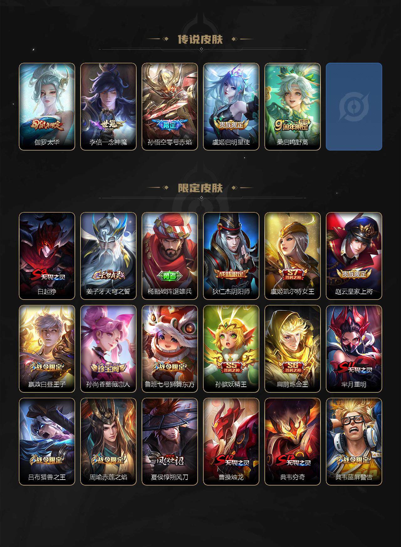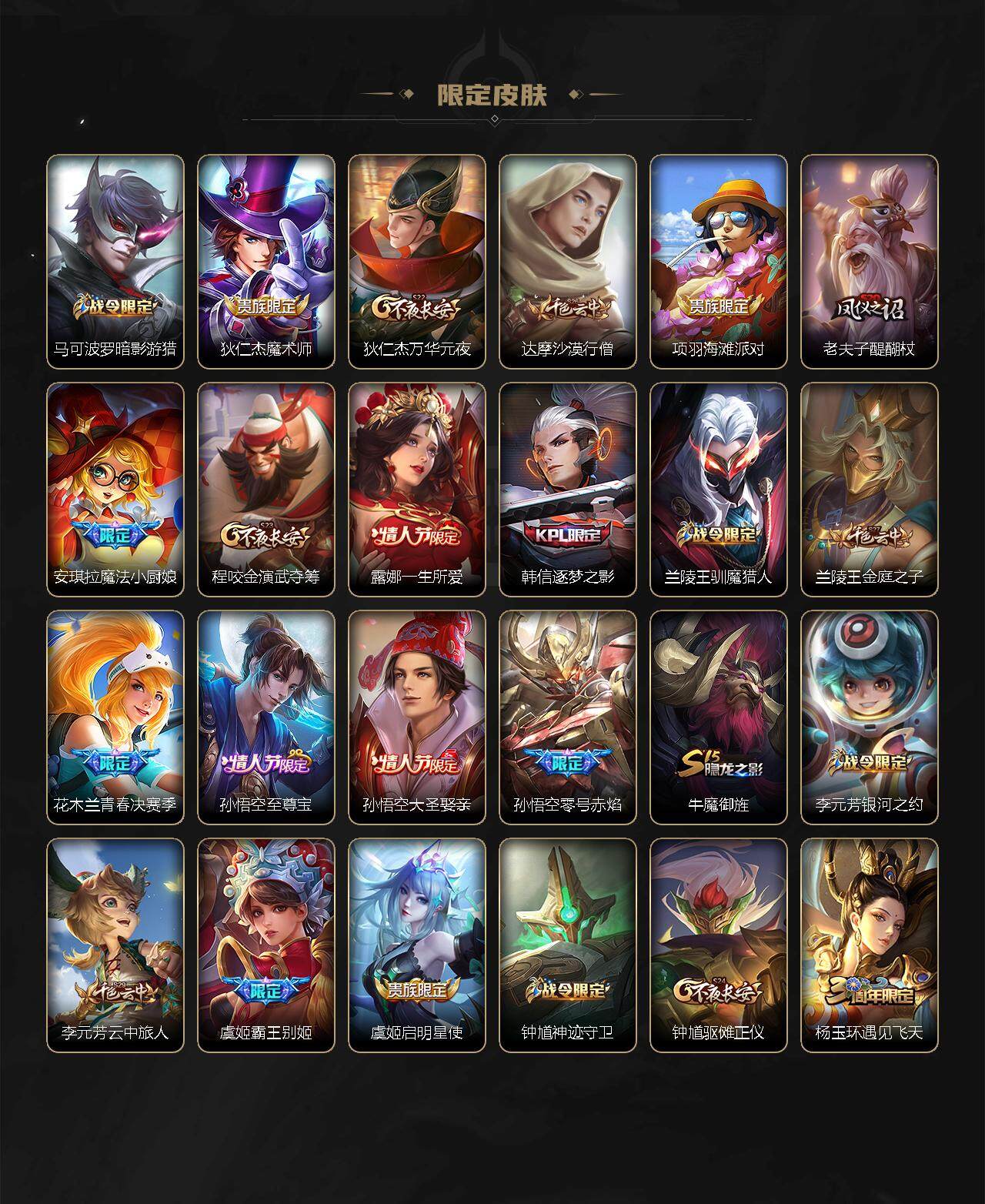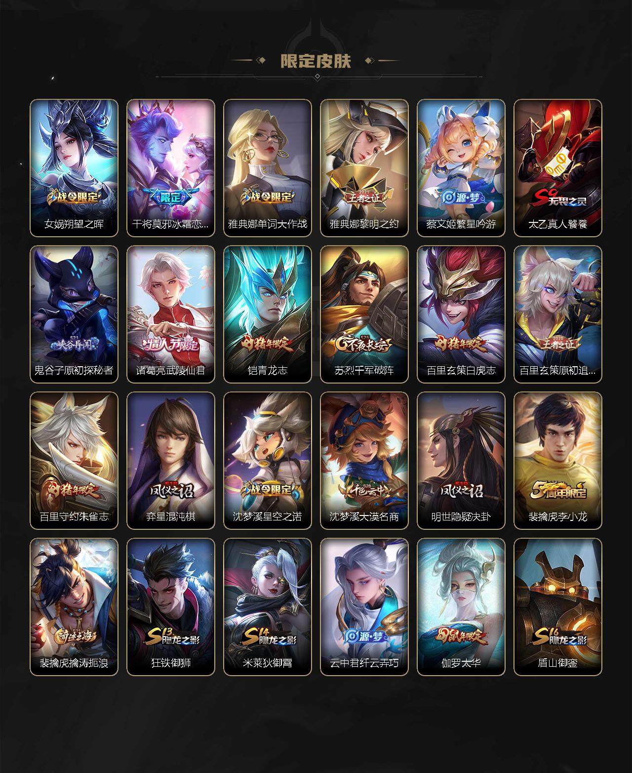 【限定皮肤】:白起狰,姜子牙天穹之誓,杨戬破阵退雄兵,狄仁杰阴阳师,虞姬凯尔特女王,赵云皇家上将,嬴政白昼王子,孙尚香蔷薇恋人,鲁班七号狮舞东方,孙膑妖精王,扁鹊炼金王,芈月重明,吕布猎兽之王,周瑜赤莲之焰,夏侯惇朔风刀,曹操烛龙,典韦穷奇,典韦蓝屏警告,马可波罗暗影游猎,狄仁杰魔术师,狄仁杰万华元夜,达摩沙漠行僧,项羽海滩派对,老夫子醍醐杖,安琪拉魔法小厨娘,程咬金演武夺筹,露娜一生所爱,韩信逐梦之影,兰陵王驯魔猎人,兰陵王金庭之子,花木兰青春决赛季,孙悟空至尊宝,孙悟空大圣娶亲,孙悟空零号赤焰,牛魔御旌,李元芳银河之约,李元芳云中旅人,虞姬霸王别姬,虞姬启明星使,钟馗神迹守卫,钟馗驱傩正仪,杨玉环遇见飞天,女娲朔望之晖,干将莫邪冰霜恋舞曲,雅典娜单词大作战,雅典娜黎明之约,蔡文姬繁星吟游,太乙真人饕餮,鬼谷子原初探秘者,诸葛亮武陵仙君,铠青龙志,苏烈千军破阵,百里玄策白虎志,百里玄策原初追逐者,百里守约朱雀志,弈星混沌棋,沈梦溪星空之诺,沈梦溪大漠名商,明世隐疑决卦,裴擒虎李小龙,裴擒虎擒涛扼浪,狂铁御狮,米莱狄御霄,云中君纤云弄巧,伽罗太华,盾山御銮,猪八戒西部大镖客,上官婉儿梁祝,蒙犽狂想玩偶喵,鲁班大师探海日志,桑启海盐诗旅,张良古海寻踪,蒙犽百解令,鬼谷子天穹祈灯,姬小满妄想食味,刘邦剑破天穹,周瑜熔金海岸