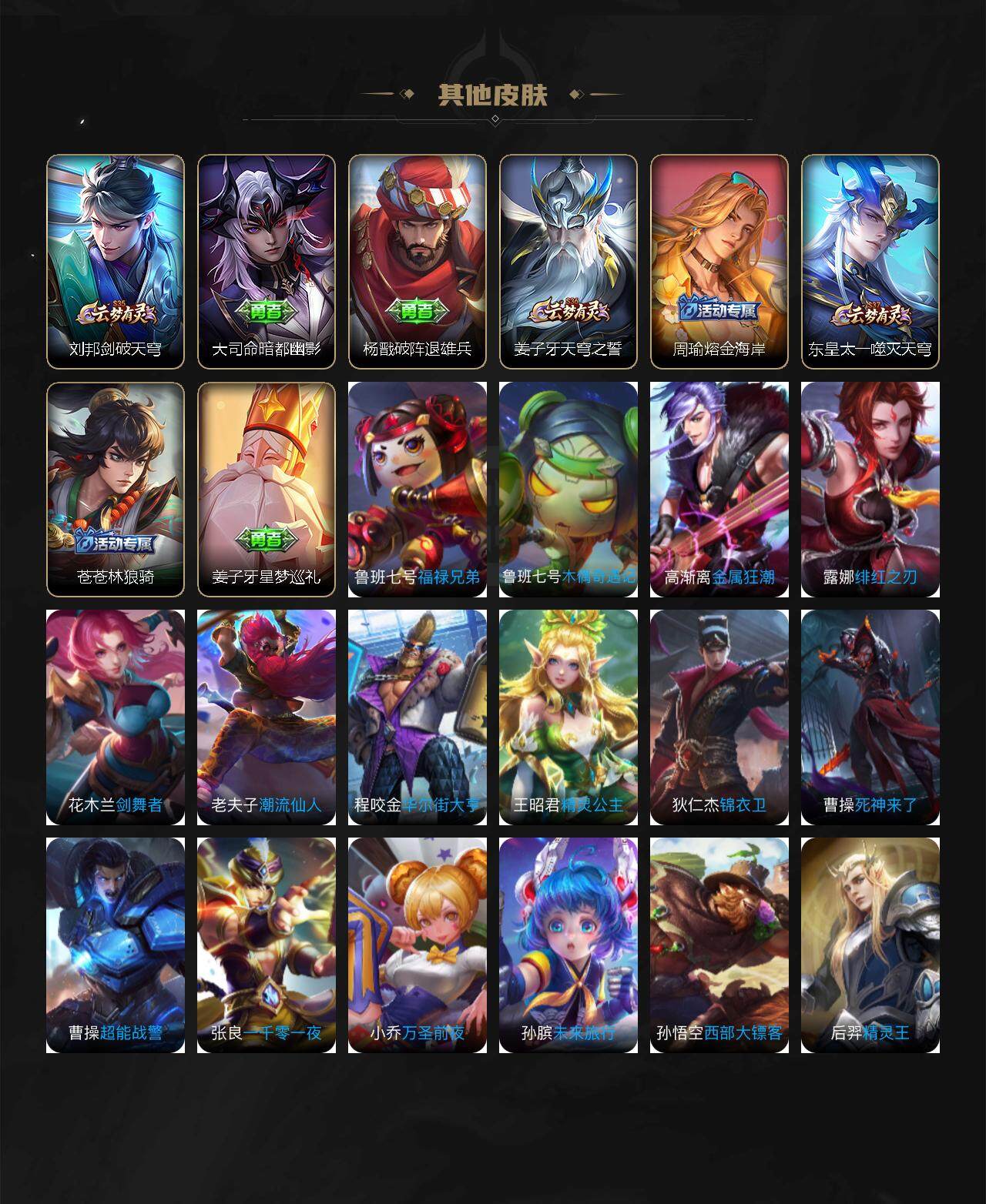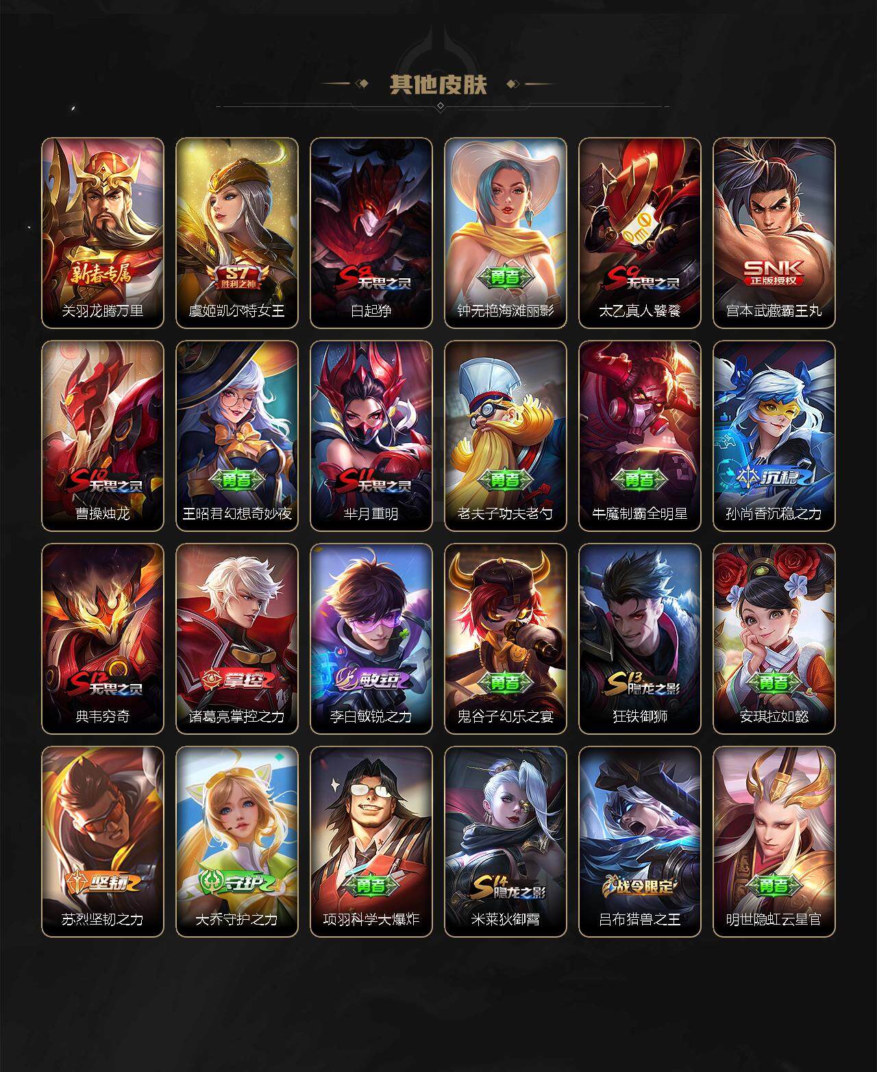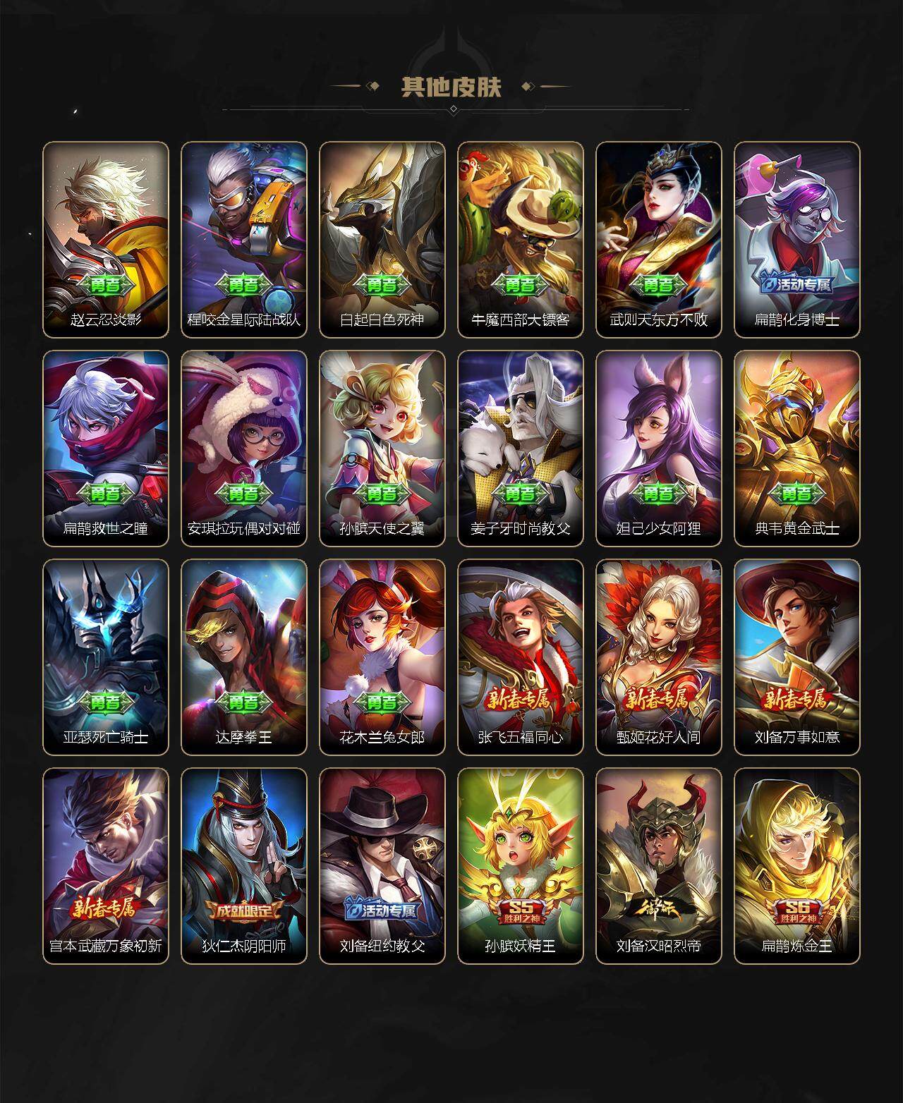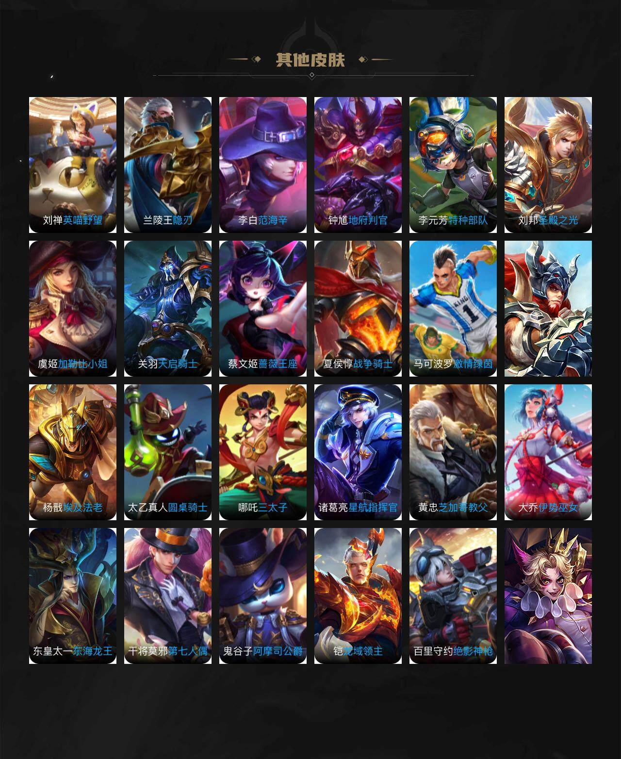 【限定皮肤】:白起狰,姜子牙天穹之誓,杨戬破阵退雄兵,狄仁杰阴阳师,虞姬凯尔特女王,赵云皇家上将,嬴政白昼王子,孙尚香蔷薇恋人,鲁班七号狮舞东方,孙膑妖精王,扁鹊炼金王,芈月重明,吕布猎兽之王,周瑜赤莲之焰,夏侯惇朔风刀,曹操烛龙,典韦穷奇,典韦蓝屏警告,马可波罗暗影游猎,狄仁杰魔术师,狄仁杰万华元夜,达摩沙漠行僧,项羽海滩派对,老夫子醍醐杖,安琪拉魔法小厨娘,程咬金演武夺筹,露娜一生所爱,韩信逐梦之影,兰陵王驯魔猎人,兰陵王金庭之子,花木兰青春决赛季,孙悟空至尊宝,孙悟空大圣娶亲,孙悟空零号赤焰,牛魔御旌,李元芳银河之约,李元芳云中旅人,虞姬霸王别姬,虞姬启明星使,钟馗神迹守卫,钟馗驱傩正仪,杨玉环遇见飞天,女娲朔望之晖,干将莫邪冰霜恋舞曲,雅典娜单词大作战,雅典娜黎明之约,蔡文姬繁星吟游,太乙真人饕餮,鬼谷子原初探秘者,诸葛亮武陵仙君,铠青龙志,苏烈千军破阵,百里玄策白虎志,百里玄策原初追逐者,百里守约朱雀志,弈星混沌棋,沈梦溪星空之诺,沈梦溪大漠名商,明世隐疑决卦,裴擒虎李小龙,裴擒虎擒涛扼浪,狂铁御狮,米莱狄御霄,云中君纤云弄巧,伽罗太华,盾山御銮,猪八戒西部大镖客,上官婉儿梁祝,蒙犽狂想玩偶喵,鲁班大师探海日志,桑启海盐诗旅,张良古海寻踪,蒙犽百解令,鬼谷子天穹祈灯,姬小满妄想食味,刘邦剑破天穹,周瑜熔金海岸