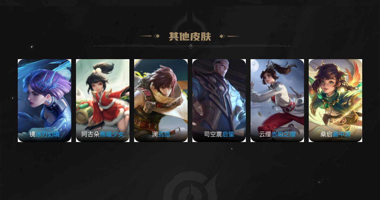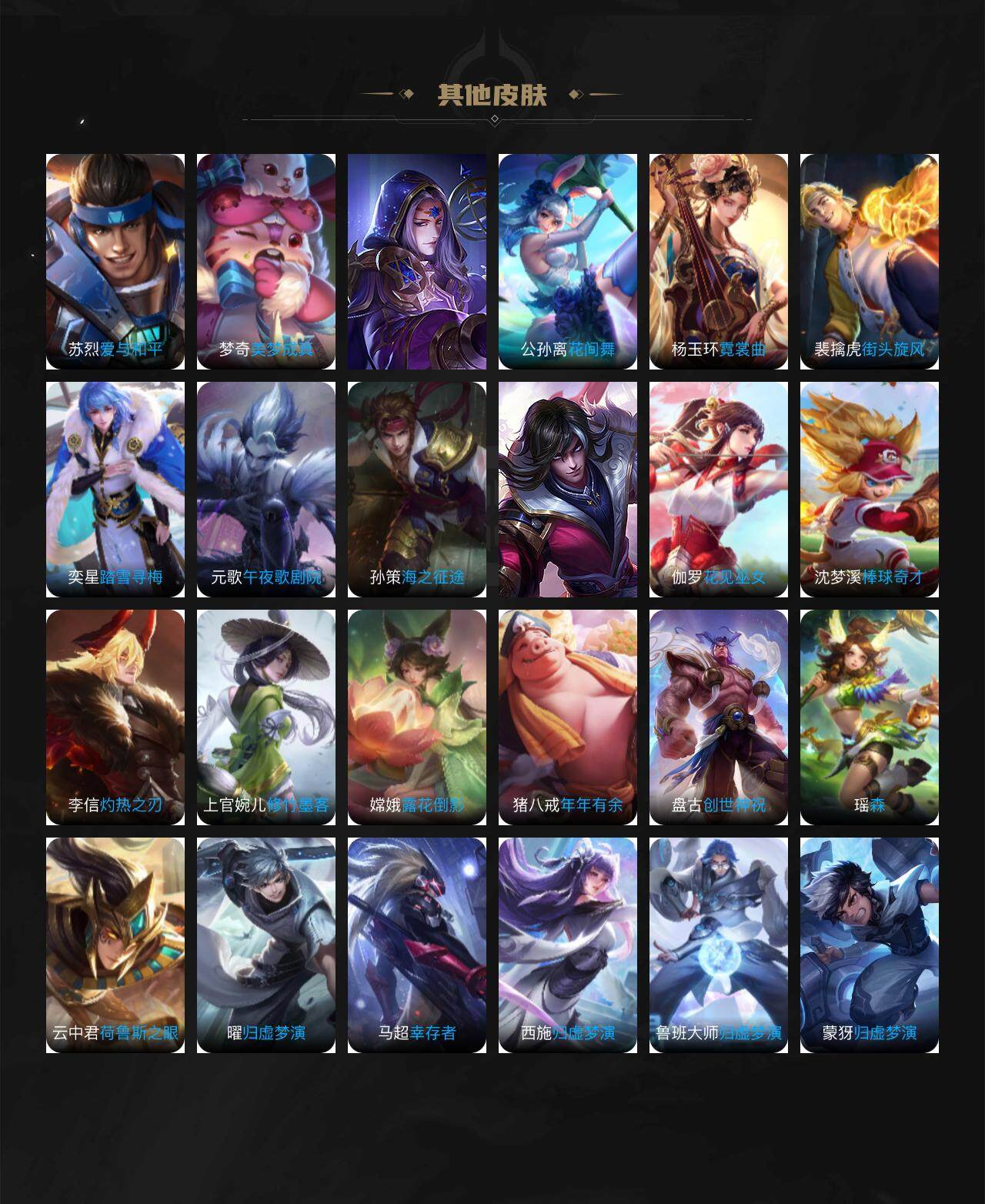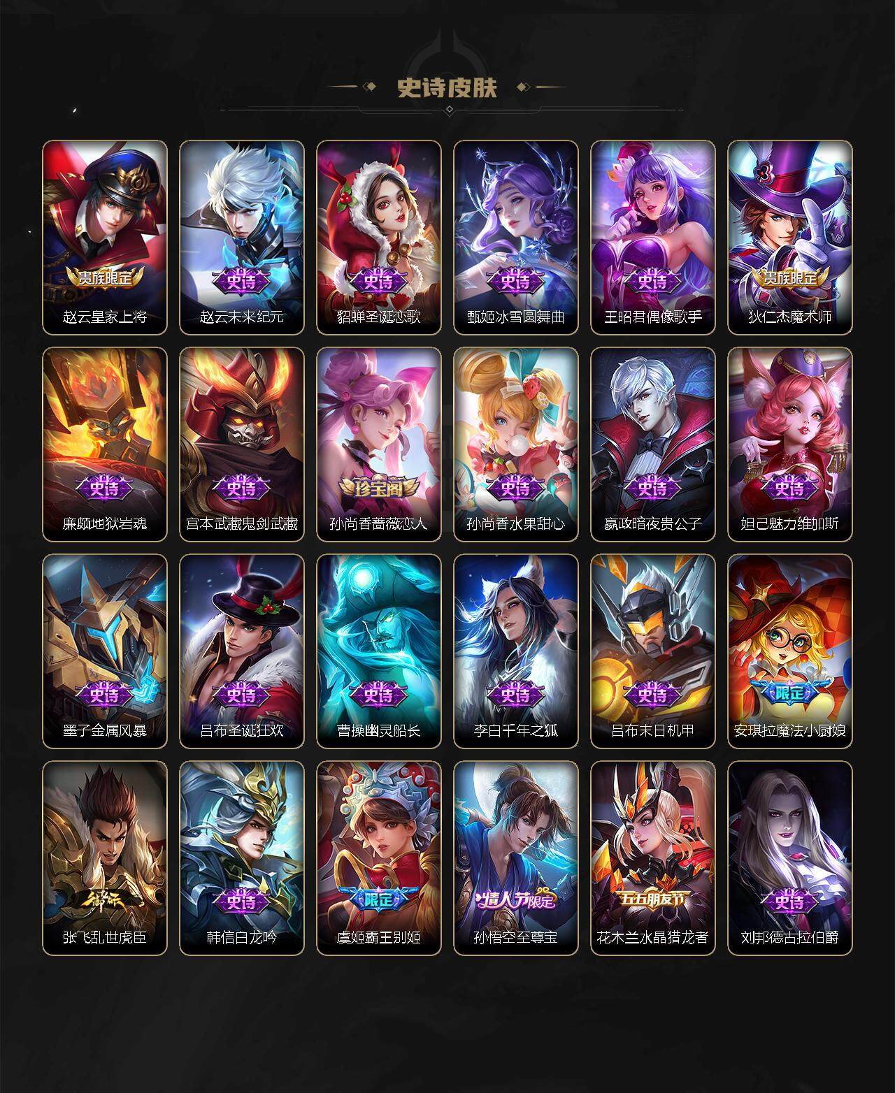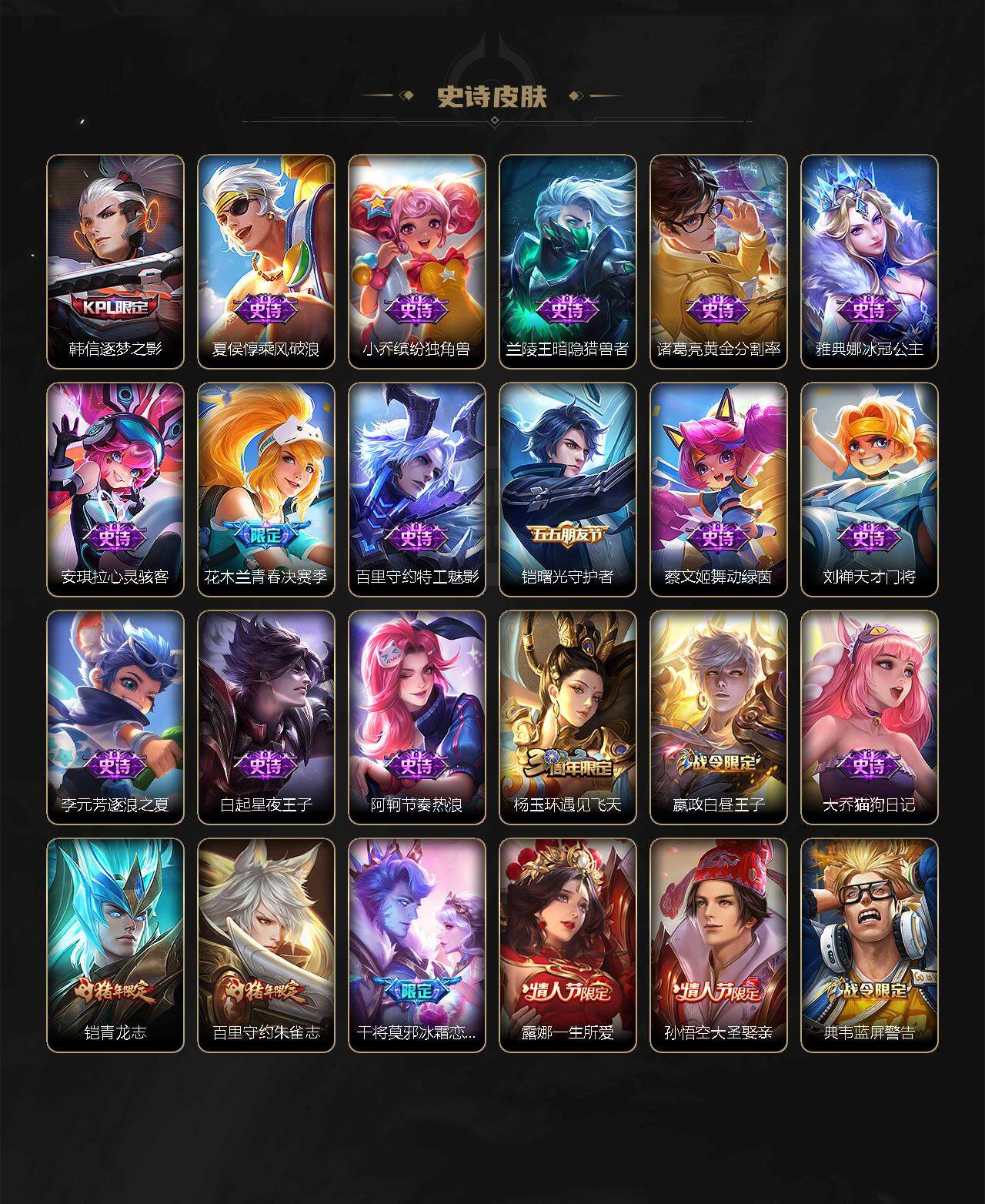 【限定皮肤】:白起狰,姜子牙天穹之誓,杨戬破阵退雄兵,狄仁杰阴阳师,虞姬凯尔特女王,赵云皇家上将,嬴政白昼王子,孙尚香蔷薇恋人,鲁班七号狮舞东方,孙膑妖精王,扁鹊炼金王,芈月重明,吕布猎兽之王,周瑜赤莲之焰,夏侯惇朔风刀,曹操烛龙,典韦穷奇,典韦蓝屏警告,马可波罗暗影游猎,狄仁杰魔术师,狄仁杰万华元夜,达摩沙漠行僧,项羽海滩派对,老夫子醍醐杖,安琪拉魔法小厨娘,程咬金演武夺筹,露娜一生所爱,韩信逐梦之影,兰陵王驯魔猎人,兰陵王金庭之子,花木兰青春决赛季,孙悟空至尊宝,孙悟空大圣娶亲,孙悟空零号赤焰,牛魔御旌,李元芳银河之约,李元芳云中旅人,虞姬霸王别姬,虞姬启明星使,钟馗神迹守卫,钟馗驱傩正仪,杨玉环遇见飞天,女娲朔望之晖,干将莫邪冰霜恋舞曲,雅典娜单词大作战,雅典娜黎明之约,蔡文姬繁星吟游,太乙真人饕餮,鬼谷子原初探秘者,诸葛亮武陵仙君,铠青龙志,苏烈千军破阵,百里玄策白虎志,百里玄策原初追逐者,百里守约朱雀志,弈星混沌棋,沈梦溪星空之诺,沈梦溪大漠名商,明世隐疑决卦,裴擒虎李小龙,裴擒虎擒涛扼浪,狂铁御狮,米莱狄御霄,云中君纤云弄巧,伽罗太华,盾山御銮,猪八戒西部大镖客,上官婉儿梁祝,蒙犽狂想玩偶喵,鲁班大师探海日志,桑启海盐诗旅,张良古海寻踪,蒙犽百解令,鬼谷子天穹祈灯,姬小满妄想食味,刘邦剑破天穹,周瑜熔金海岸