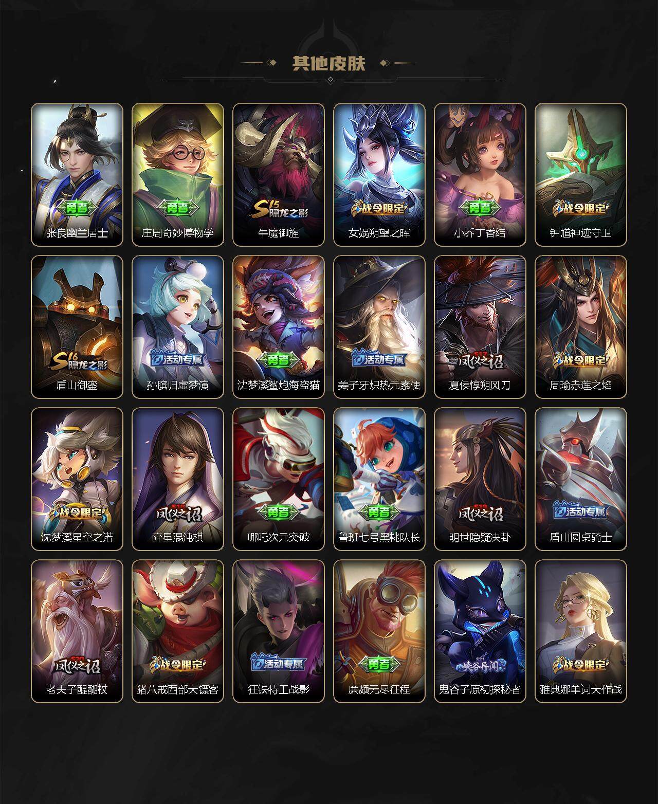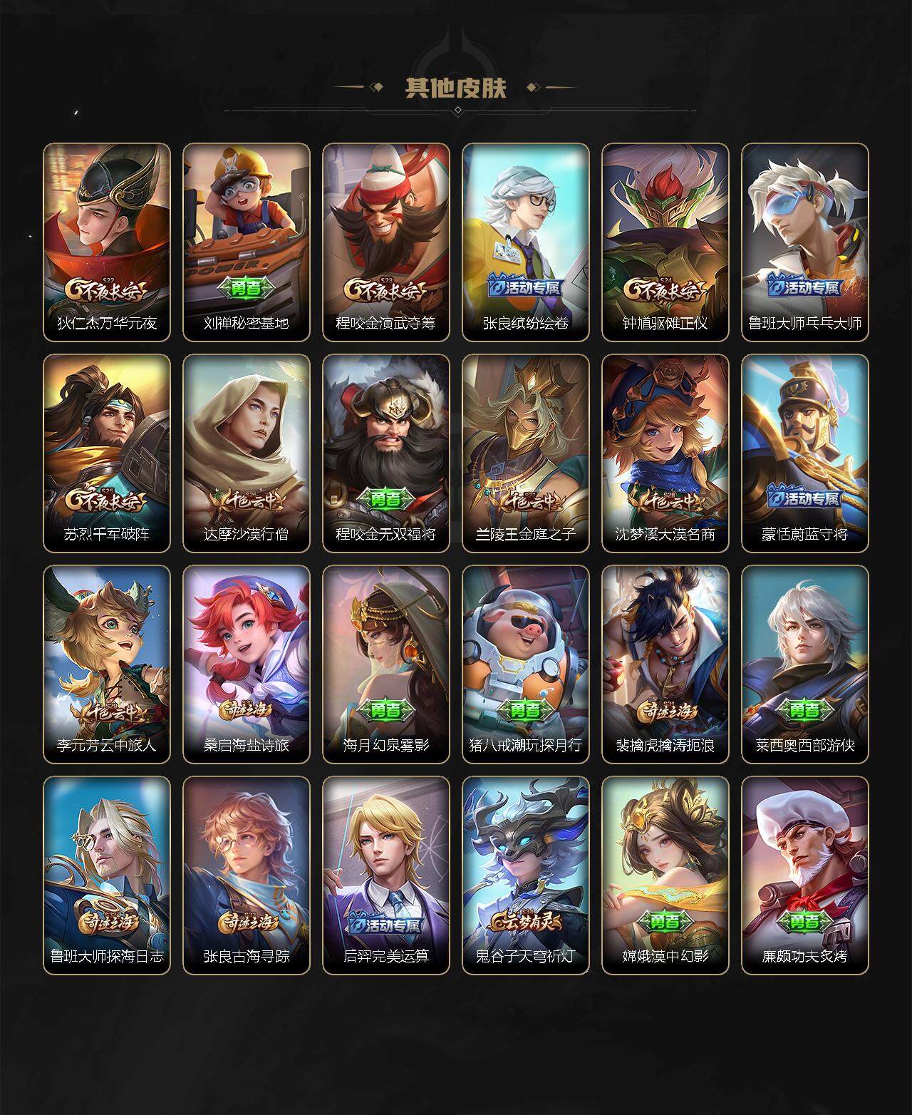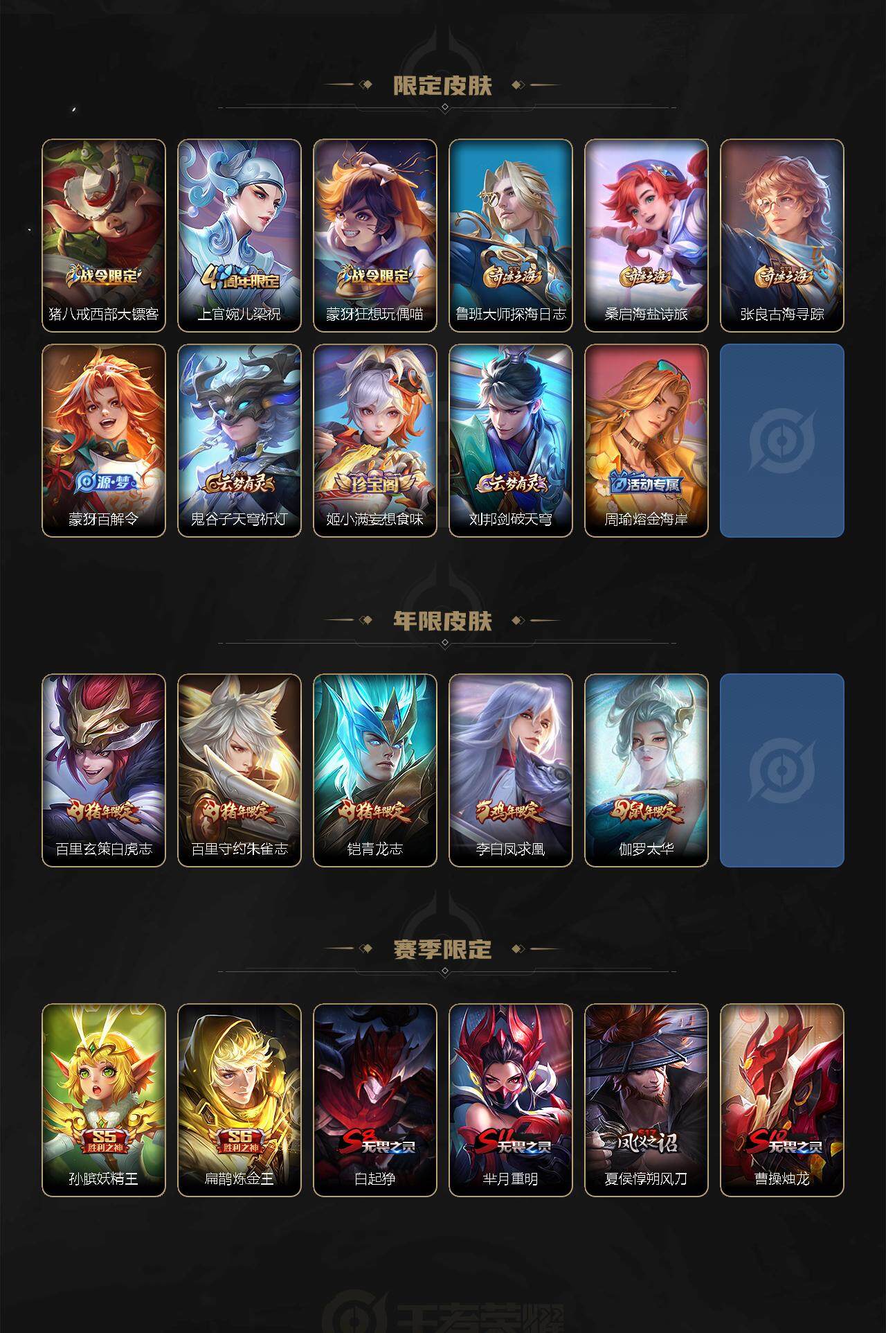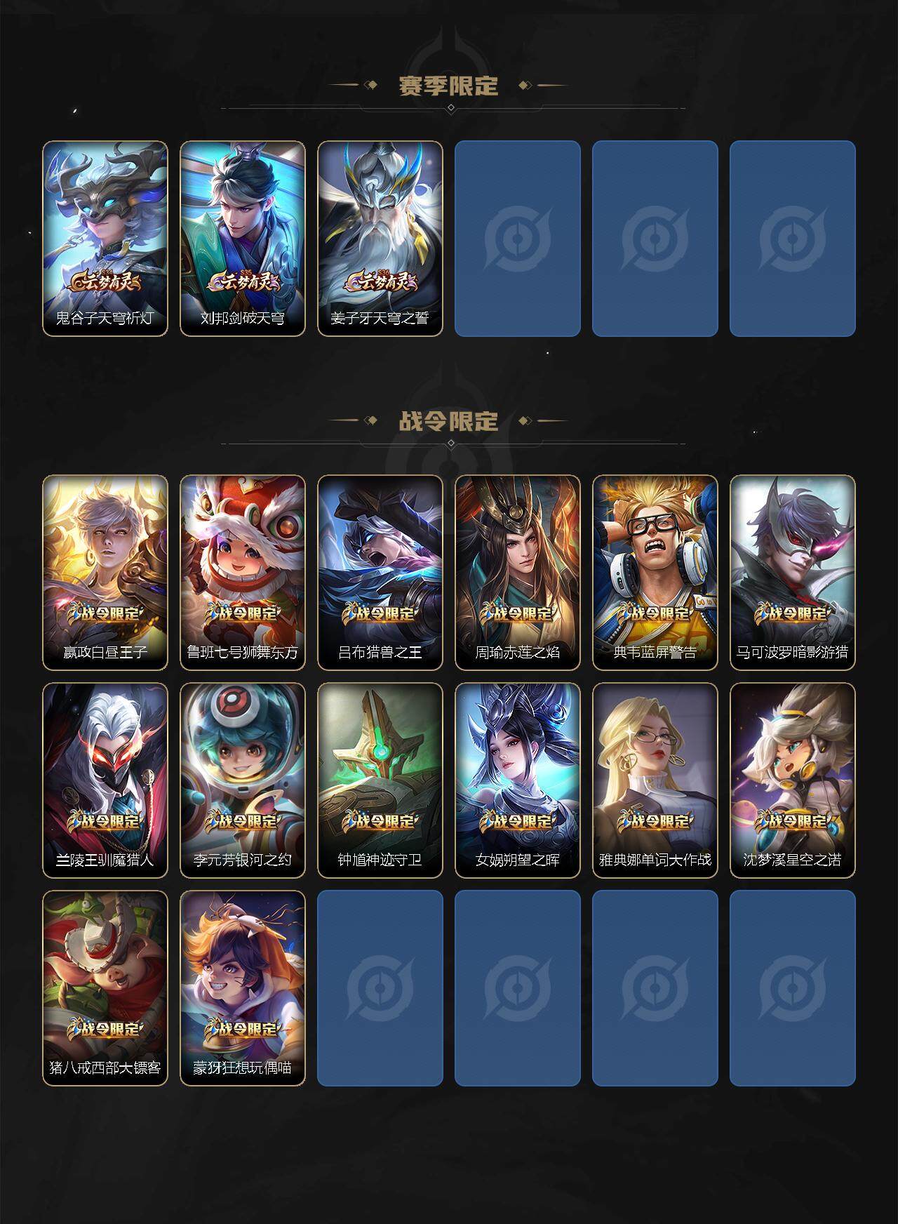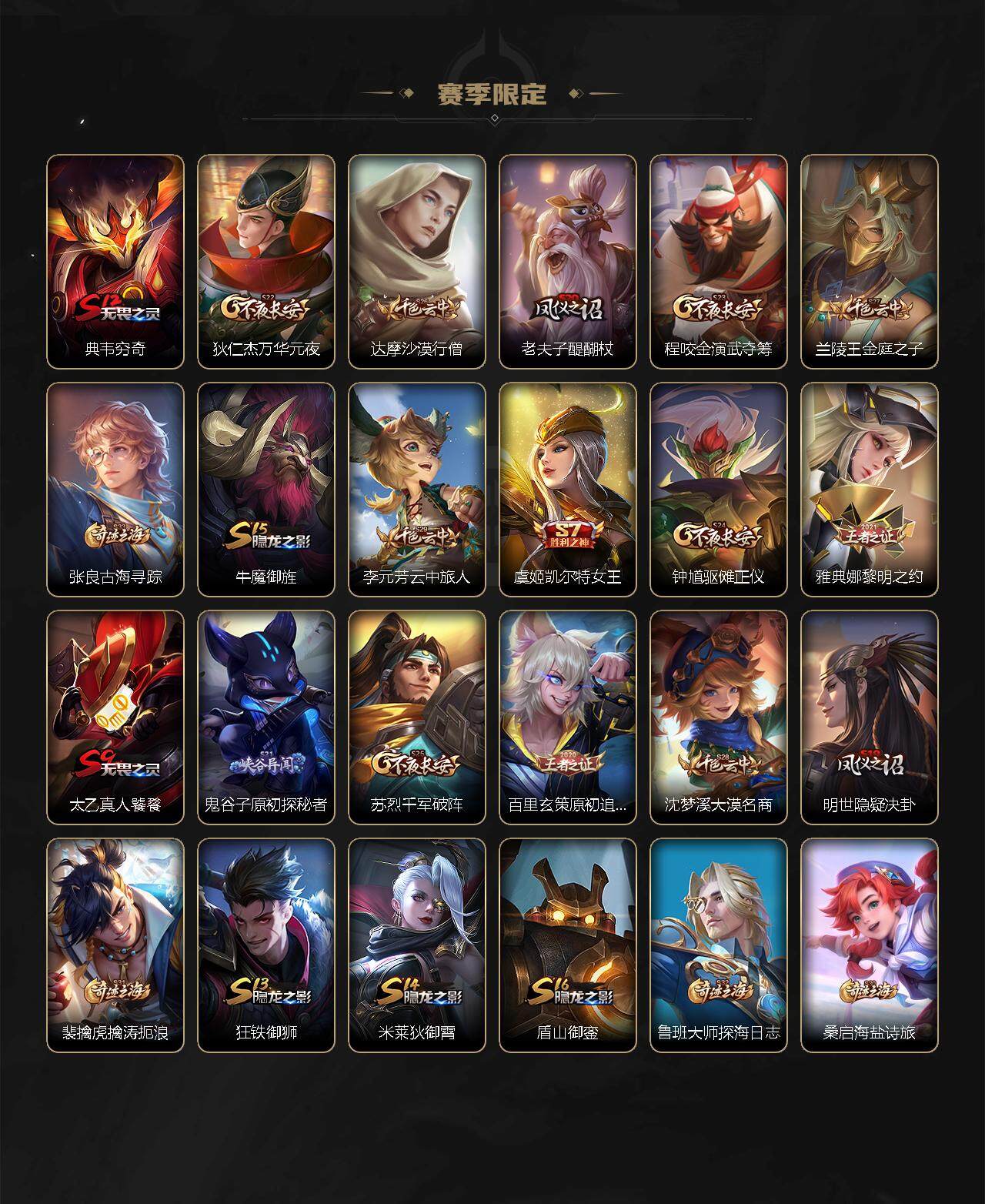【赛季限定】:孙膑妖精王,扁鹊炼金王,白起狰,芈月重明,夏侯惇朔风刀,曹操烛龙,典韦穷奇,狄仁杰万华元夜,达摩沙漠行僧,老夫子醍醐杖,程咬金演武夺筹,兰陵王金庭之子,张良古海寻踪,牛魔御旌,李元芳云中旅人,虞姬凯尔特女王,钟馗驱傩正仪,雅典娜黎明之约,太乙真人饕餮,鬼谷子原初探秘者,苏烈