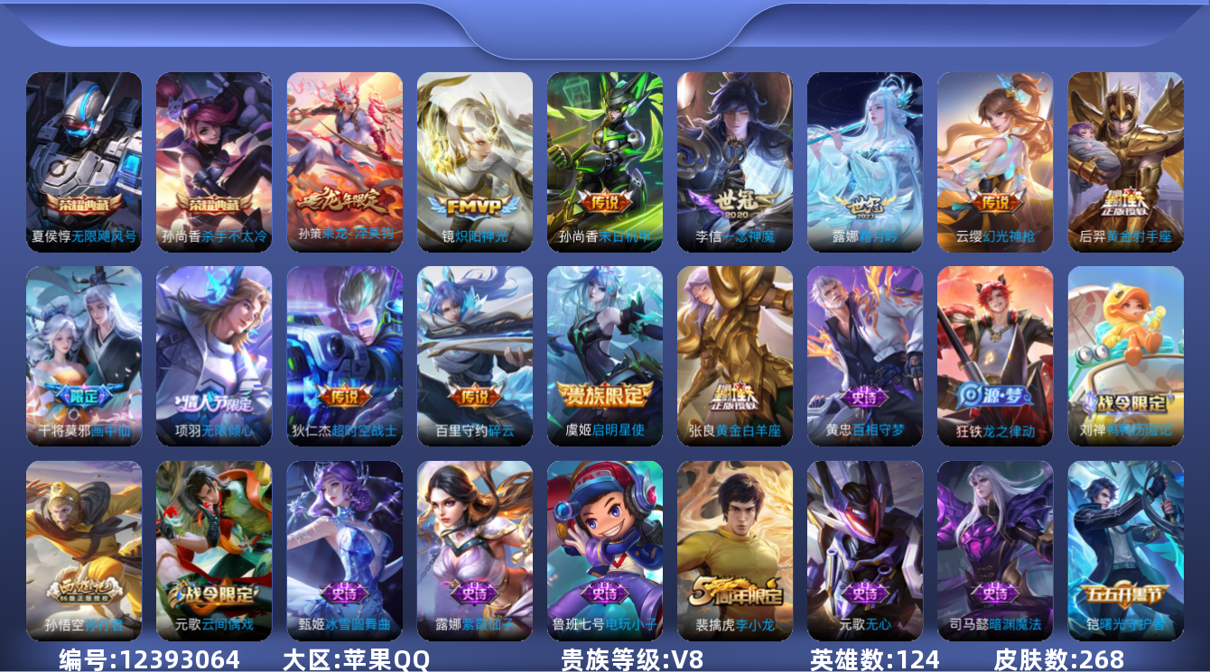 [12393064]【商品标题】:苹果Q-V8-最强王者段位-124英雄-268皮肤-2典藏-0珍品无双-0无双-0珍品传说-13传说-75史诗