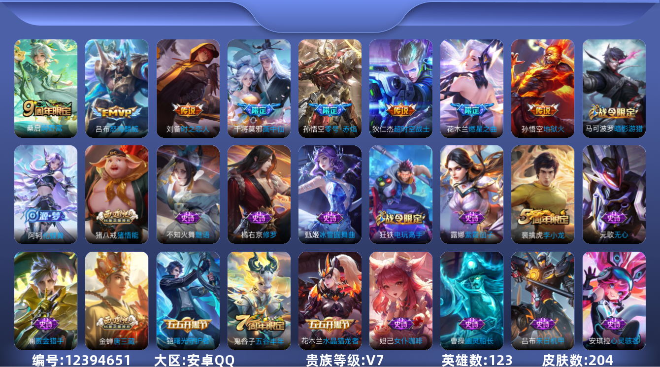 [12394651]【商品标题】:安卓Q-V4-至尊星耀III段位-123英雄-204皮肤-0典藏-0珍品无双-0无双-0珍品传说-8传说-51史诗