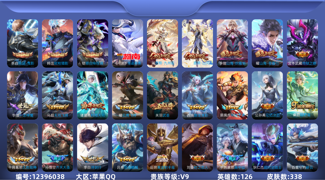 [12396038]【商品标题】:苹果Q-V9-至尊星耀III段位-126英雄-338皮肤-3典藏-0珍品无双-0无双-1珍品传说-25传说-86史诗