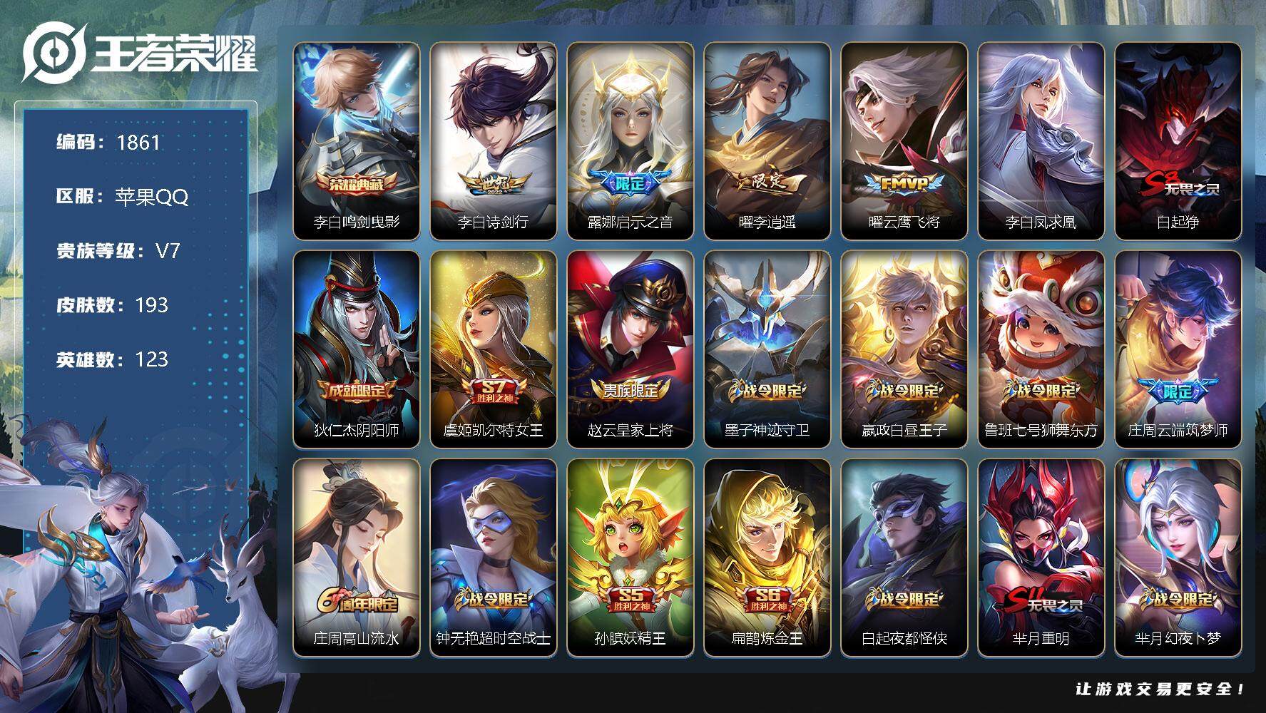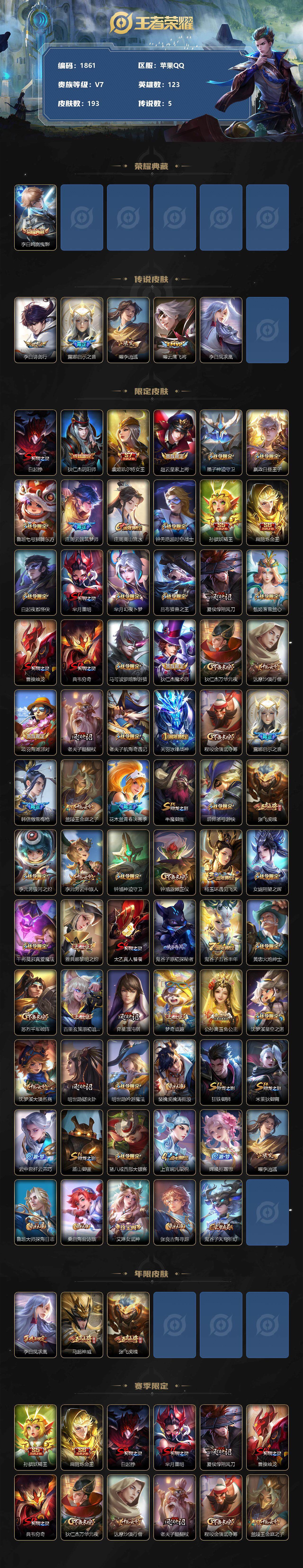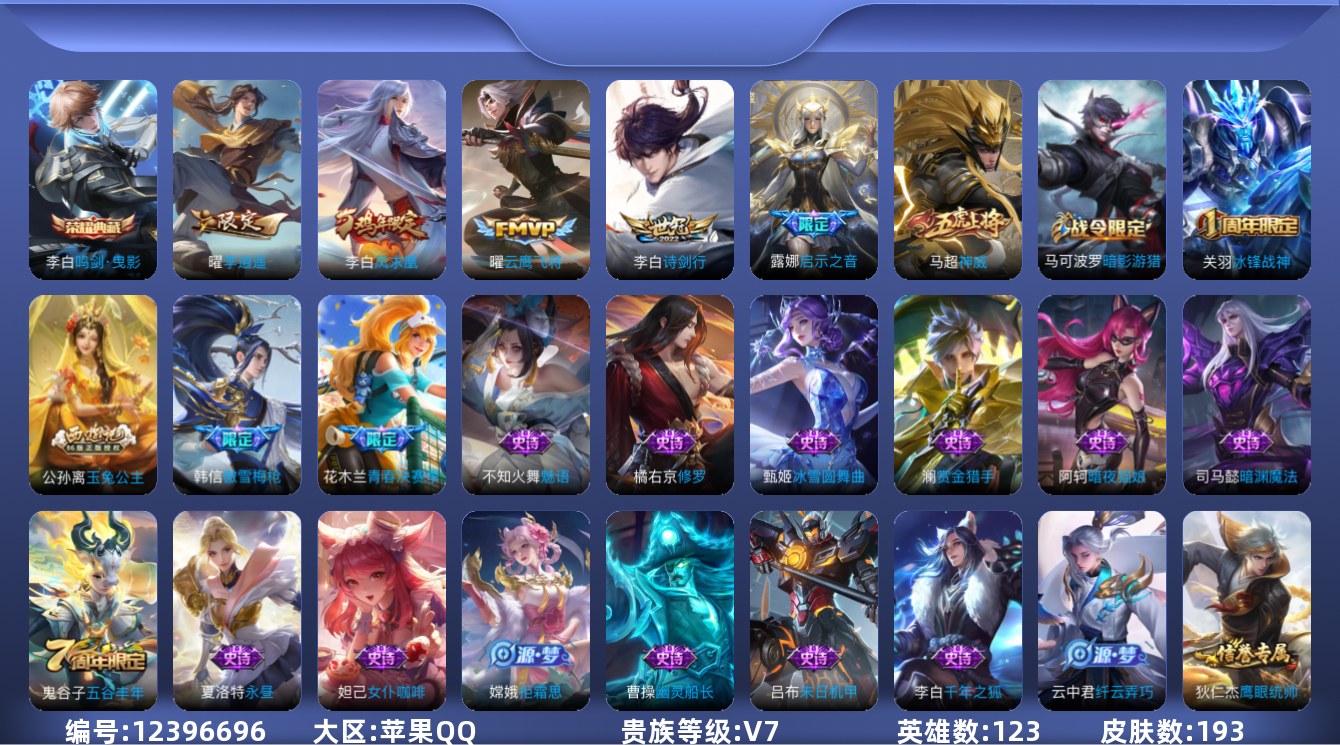 [12396696]【商品标题】:苹果Q-V0-永恒钻石III段位-123英雄-193皮肤-1典藏-0珍品无双-0无双-0珍品传说-5传说-56史诗