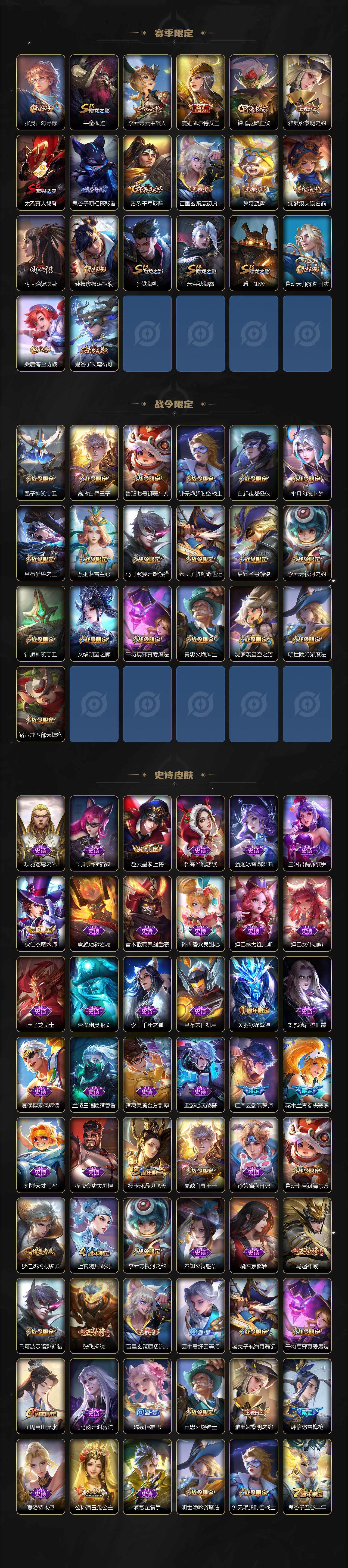【赛季限定】:孙膑妖精王,扁鹊炼金王,白起狰,芈月重明,夏侯惇朔风刀,曹操烛龙,典韦穷奇,狄仁杰万华元夜,达摩沙漠行僧,老夫子醍醐杖,程咬金演武夺筹,兰陵王金庭之子,张良古海寻踪,牛魔御旌,李元芳云中旅人,虞姬凯尔特女王,钟馗驱傩正仪,雅典娜黎明之约,太乙真人饕餮,鬼谷子原初探秘者,苏烈千军破阵,百里玄策原初追逐者,弈星混沌棋,梦奇顽趣,沈梦溪大漠名商,明世隐疑决卦,裴擒虎擒涛扼浪,狂铁御狮,米莱狄御霄,盾山御銮,鲁班大师探海日志,桑启海盐诗旅,鬼谷子天穹祈灯