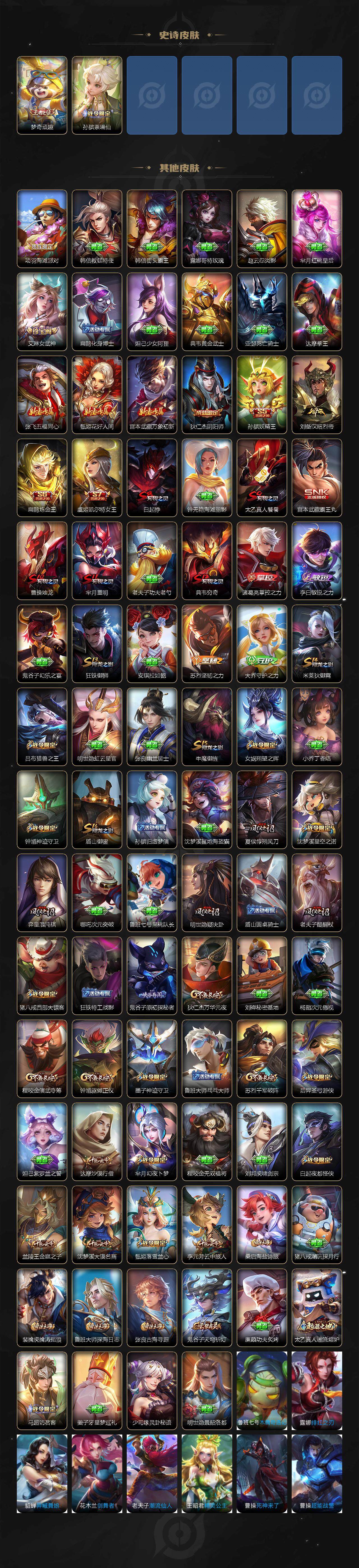 【限定皮肤】:白起狰,狄仁杰阴阳师,虞姬凯尔特女王,赵云皇家上将,墨子神迹守卫,嬴政白昼王子,鲁班七号狮舞东方,庄周云端筑梦师,庄周高山流水,钟无艳超时空战士,孙膑妖精王,扁鹊炼金王,白起夜都怪侠,芈月重明,芈月幻夜卜梦,吕布猎兽之王,夏侯惇朔风刀,甄姬落雪兰心,曹操烛龙,典韦穷奇,马可波罗暗影游猎,狄仁杰魔术师,狄仁杰万华元夜,达摩沙漠行僧,项羽海滩派对,老夫子醍醐杖,老夫子航海奇遇记,关羽冰锋战神,程咬金演武夺筹,露娜启示之音,韩信傲雪梅枪,兰陵王金庭之子,花木兰青春决赛季,牛魔御旌,后羿圣弓游侠,张飞虎魄,李元芳银河之约,李元芳云中旅人,钟馗神迹守卫,钟馗驱傩正仪,杨玉环遇见飞天,女娲朔望之晖,干将莫邪真爱魔法,雅典娜黎明之约,太乙真人饕餮,鬼谷子原初探秘者,鬼谷子五谷丰年,黄忠火炮绅士,苏烈千军破阵,百里玄策原初追逐者,弈星混沌棋,梦奇顽趣,公孙离玉兔公主,沈梦溪星空之诺,沈梦溪大漠名商,明世隐疑决卦,明世隐吟游魔法,裴擒虎擒涛扼浪,狂铁御狮,米莱狄御霄,云中君纤云弄巧,盾山御銮,猪八戒西部大镖客,上官婉儿梁祝,嫦娥拒霜思,曜李逍遥 ,鲁班大师探海日志,桑启海盐诗旅,艾琳女武神,张良古海寻踪,鬼谷子天穹祈灯